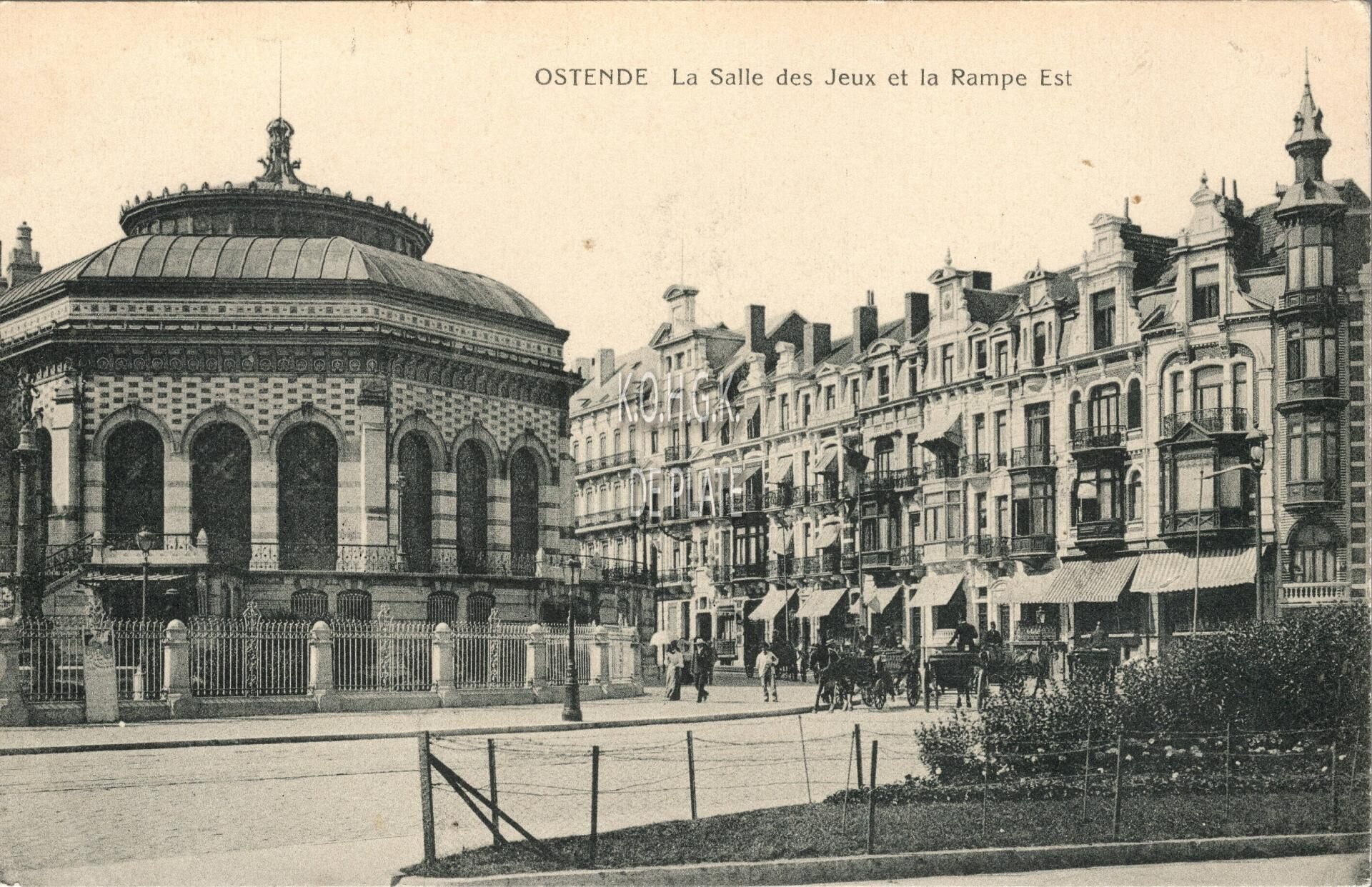 Edition : E.L. Ostende, N° 5355. - Ostende - La Salle des Jeux et la Rampe Est. - Gedeelte van de zuidgevel van het derde Kursaal waar de speelzaal gevestigd was. Met zicht op de Kursaal-Oosthelling.