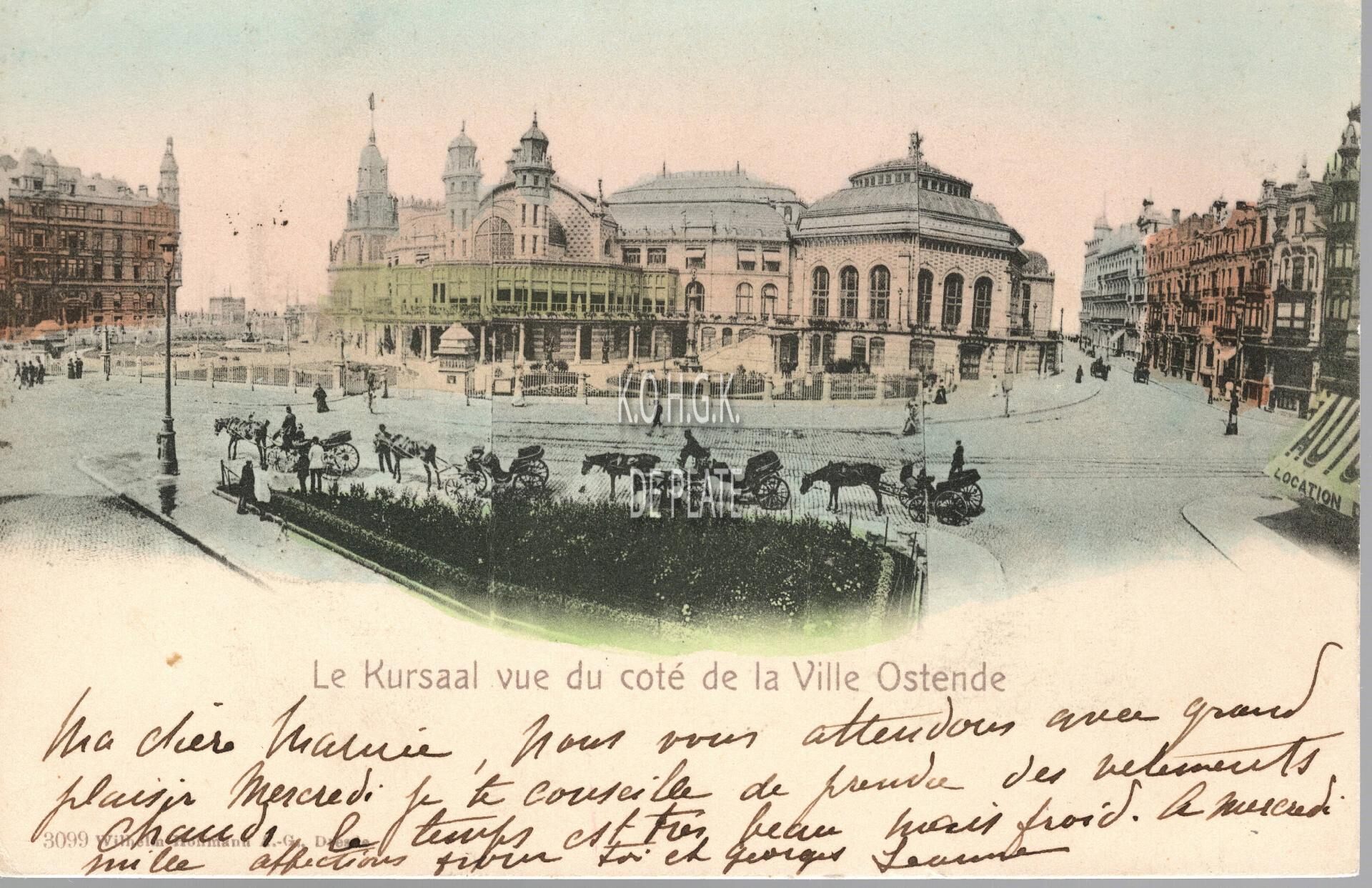 3099. Wilhelm Hoffmann A.G., Dresden, N° 3099. -. Le Kursaal vue du coté de la Ville Ostende. - Bijgekleurde kaart. -Samengestelde prentkaart : links de Westhelling, in het midden de zuidgevel en rechts de Oosthelling. Vooraan de standplaats van de paardenkoetsen