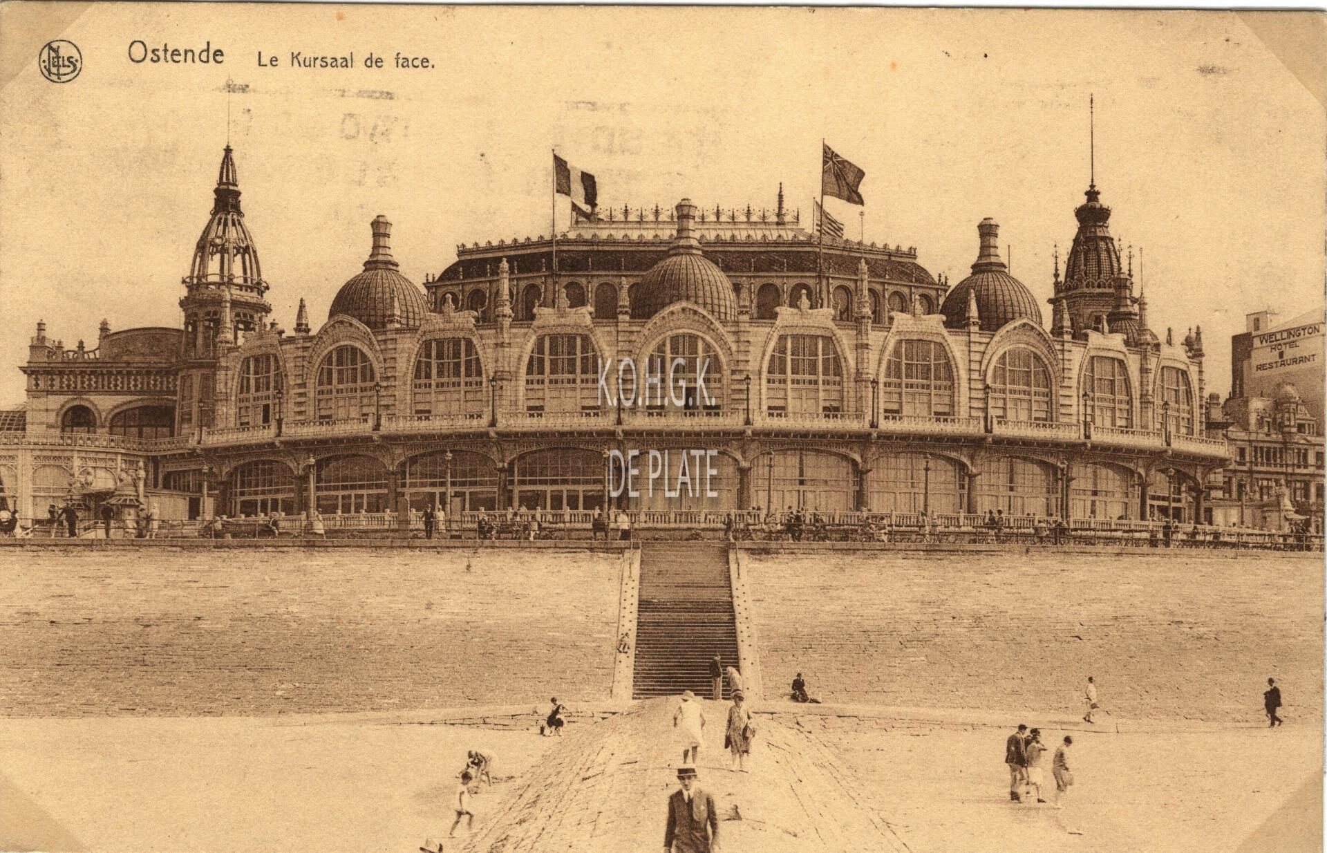 Nels. Ostende - Le Kursaal de face. - De noordgevel van het derde Kursaal langs de Zeedijk, gezien vanaf het Groot Strand. Vooraan, een golfbreker
