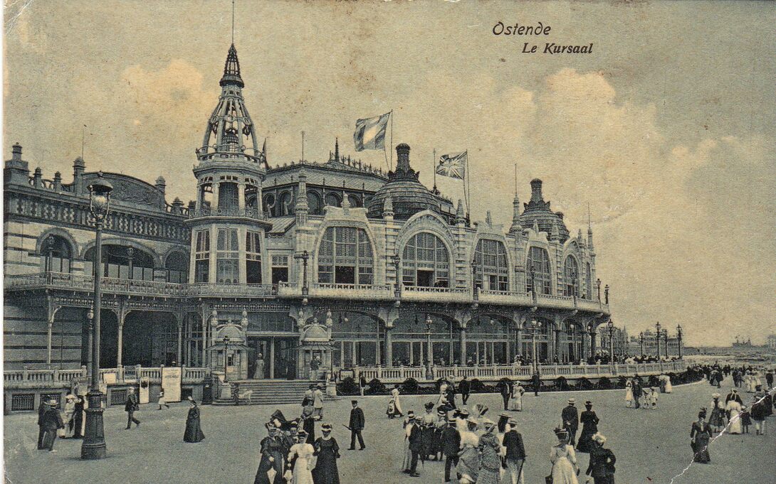 Edit. V.G. [=Victor Grégoire], 42, Avenue du Midi, Bruxelles. - Ostende - Le Kursaal. - Oostende in de Belle Epoque. De noordgevel van het derde Kursaal gelegen langs de Zeedijk, met "La tourelle fleurie". Links, één van de eerste straatlantaarns met elektrische verlichting.