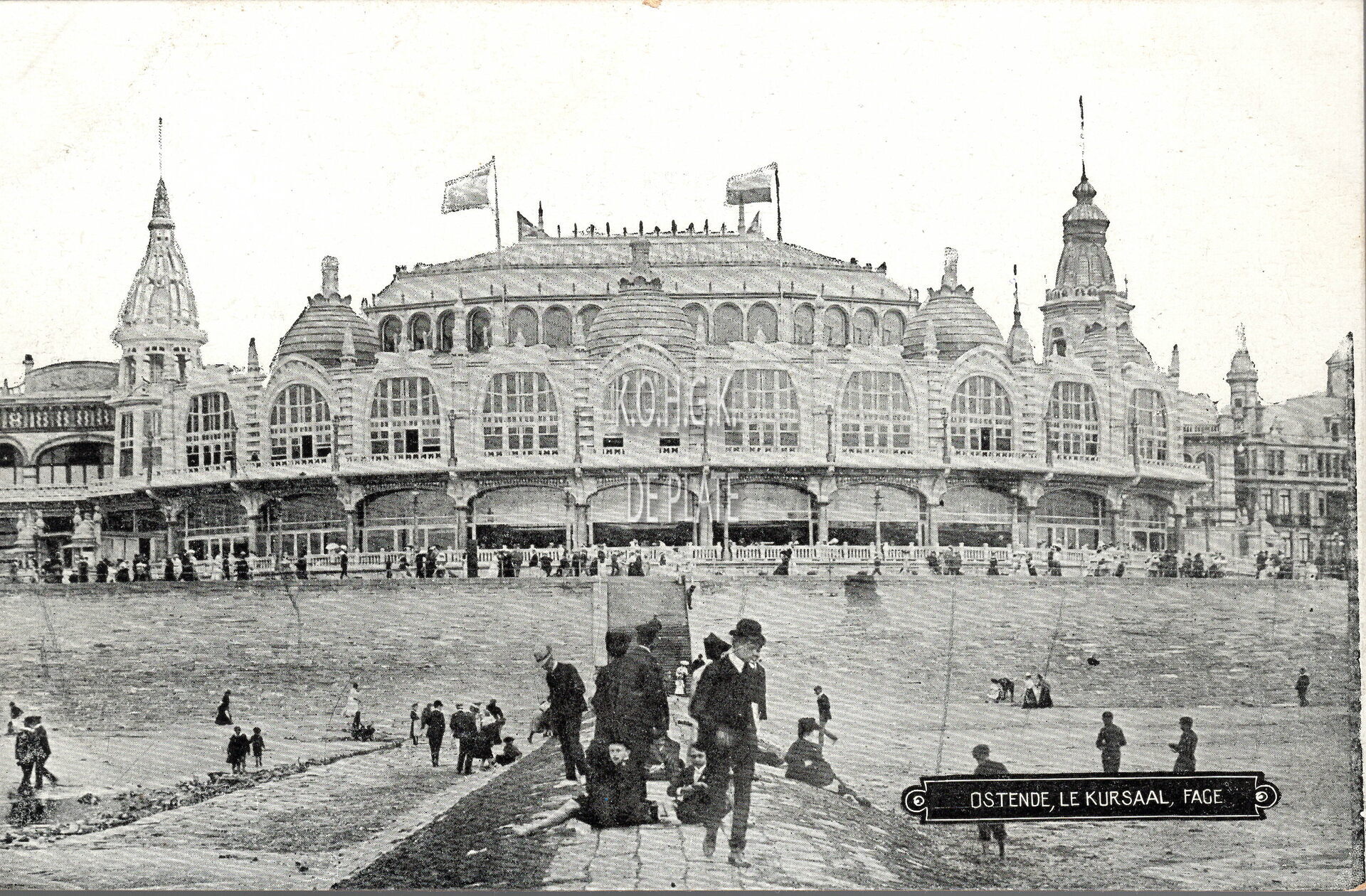 Victor Grégoire/V.G. - Ostende - Le Kursaal, face. - De noordgevel van de derde Kursaaal langs de Zeedijk, gezien vanaf een golfbreker op het groot strand