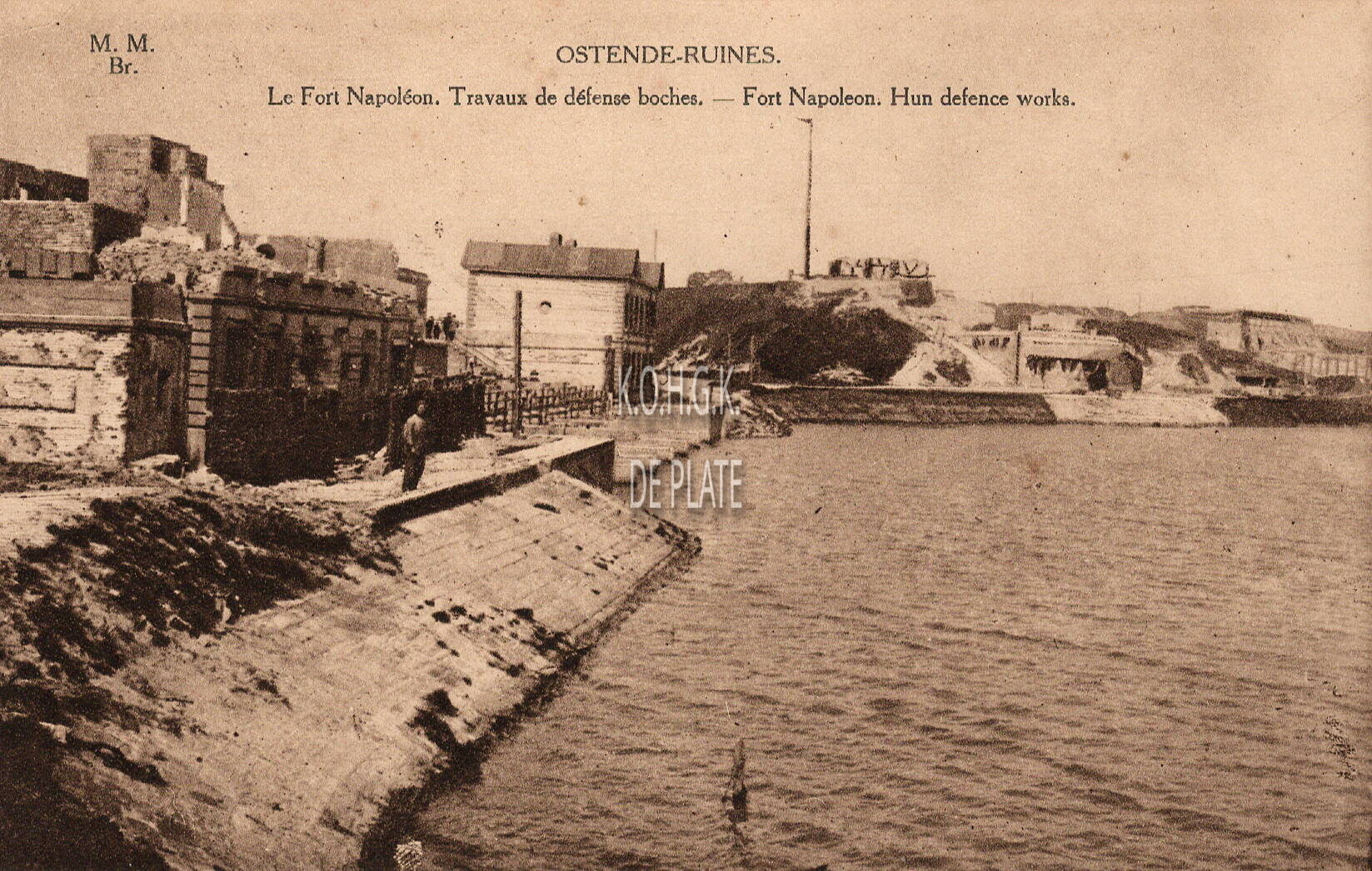 M.M.Br., Marco Marcovici. - Le Fort Napoléon. Travaux de défence boches. Fort Napoleon. Hun defence works. - Misleidende onderschriften. De batterij Eylau was gelegen op de oosteroever op het gedeelte dicht bij de haven, genaamd de "Halve Maan". We zien een gedeelte van de militaire bouwwerken gelegen nabij de Leopoldsluis.