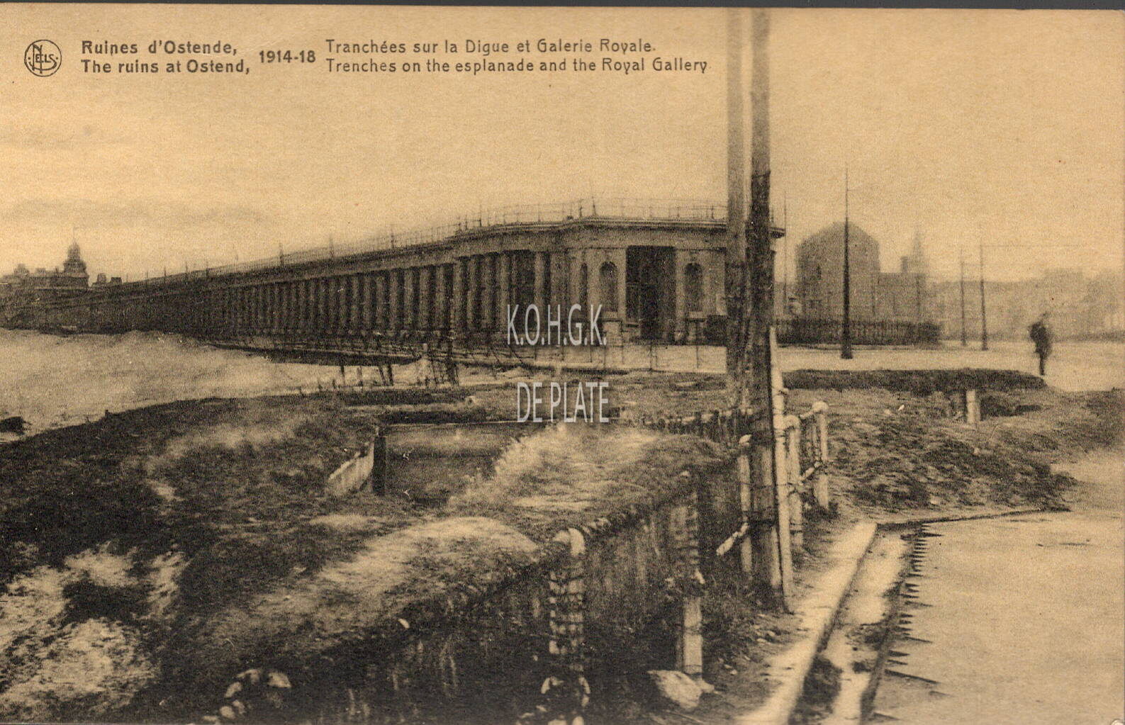 Nels. Edition J. Revyn, 14, rue du Canada, Bruxelles. - Ruines d'Ostende 1914-18 Tranchées sur la Digue et Galerie Royale. The ruins at Ostende 1914-18 Trenches on the esplanade and the Royal Gallery. - De Zeedijk, met vooraan de loopgraven van de batterij Gneisenau. Wat verder, de Koninklijke Gaanderijen. Foto genomen na de oorlog.