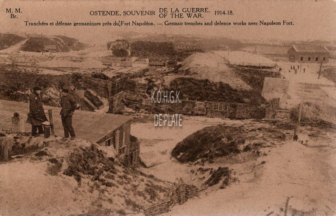 M.M.Br. - Ostende, souvenir de la guerre. of the war 1914-18. Tranchées et défense germaniques près du Fort Napoléon. German trenches and defence works near Napoleon Fort. Foto van na de oorlog.