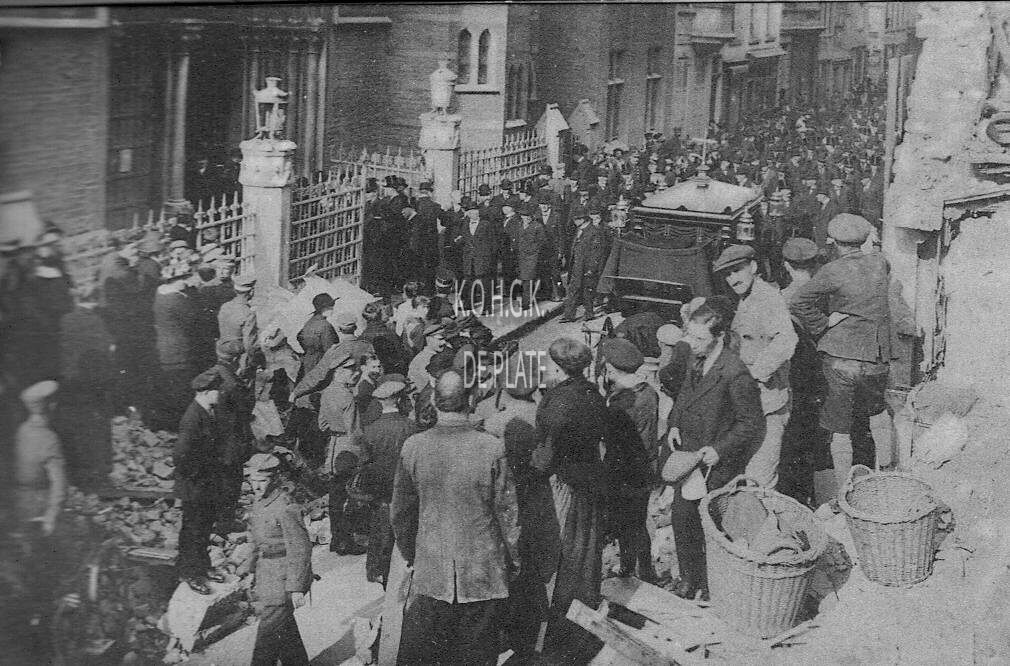 Postkaart : Eerste Wereldoorlog. Begrafenisstoet van de familie Elleboudt nabij de Dominicanenkerk (1917)