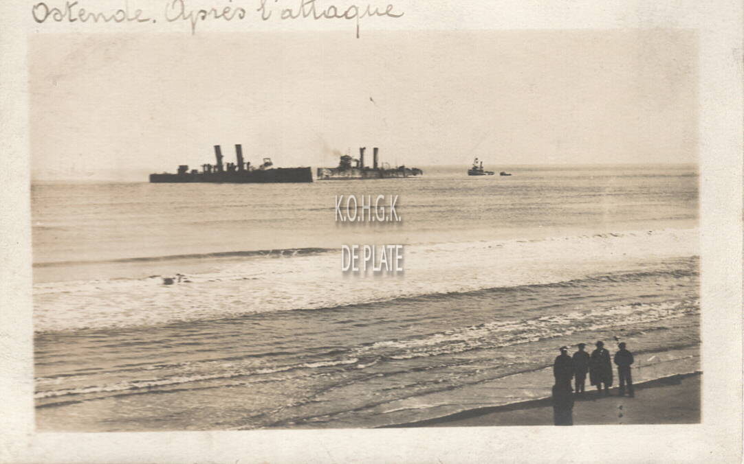 Omschrijving De aan de grond gelopen Britse kruisers H.M.S. Brilliant, links en H.M.S. Sirius, na de tweede mislukte blokkade poging van de havengeul van Oostende van 22-23 april 1918. Trefwoorden POSTKAARTEN EERSTE WERELDOORLOG IN FOTO'S SIRIUS (H.M.S.) (KRUISER) SCHEPEN ; SIRIUS (H.M.S.) (KRUISER) BRILLIANT (H.M.S.) (KRUISER) SCHEPEN ; BRILLIANT (H.M.S.) (KRUISER) OORLOGSSCHEPEN ROYAL NAVY Plaatskenmerk ARCHIEF 202 08-09 POSTKAARTENARCHIEF Inventarisnummers 2017/0787 04/ 1918 Collectie Fotoarchief De Plate Print