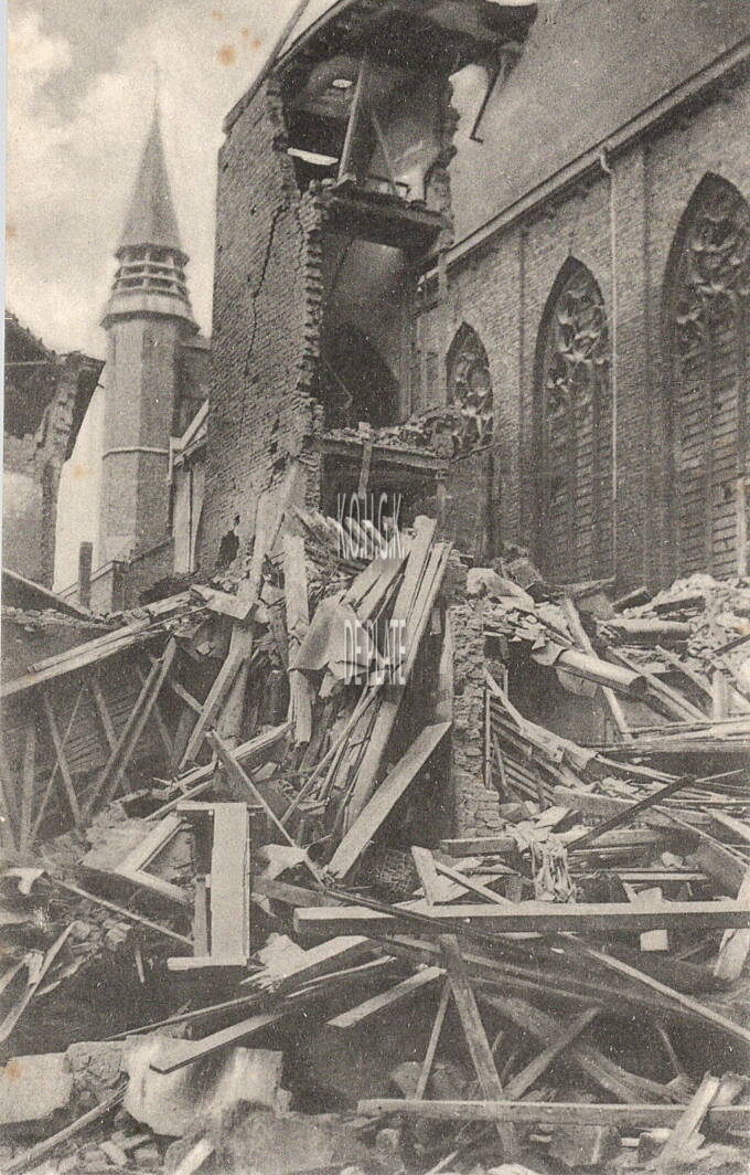 Nels. Edition René Baervoets, 7, rue Longue, Ostende. - Ostende - Rue Christine Boucherie Vanden Berghe, détruite par un obus dans la nuit du 25 au 26 septembre 1917. - Naast de Dominicanenkerk in de Christinastraat was de slagerij Vanden Berghe. Tijdens de beschieting van 25 september 1917 werden vanonder de puinen de lijken gehaald van de vader, de moeder en een kind, de grootmoeder en vier ingekwartierde Duitse soldaten. Slechts één inwonende oom bracht het er levend vanaf.