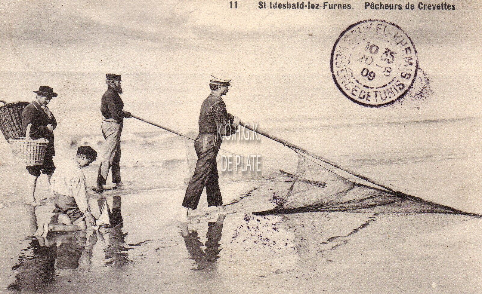 N° 11. - St-Idesbald-les-Furnes - Pêcheurs de Crevettes. - Twee garnalenkruiers met hun steeknet aan het werk. Links, een man met kruikorf of bagge.