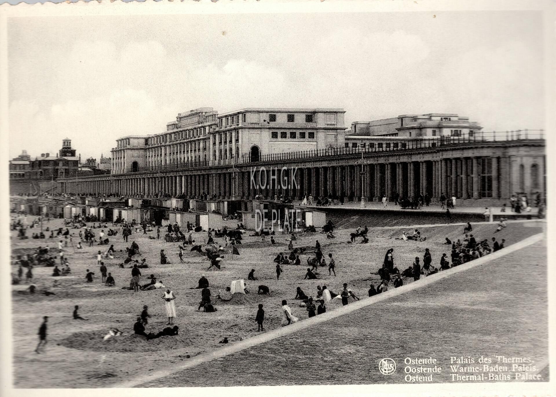 Formaat : 10, 5 x 15 cm. - Nels. "Bromurite". Ostende - Palais des Thermes. Oostende - Warme-Baden Paleis. Ostend - Thermal-Baths Palace. - Opname vanaf de Zeedijk met zicht op de Koninklijke Gaanderijen, het hotel en links het Koninklijk Chalet. Het "Grand Hôtel" maakt deel uit van het Palais des Thermes. Het is gedeeltelijk gebouwd op de Koninklijke Gaanderijen en werd ingehuldigd op 28/06/1933 door Koning Albert I en Koningin Elisabeth. Vooraan, strandrecreatie op het Groot Strand.