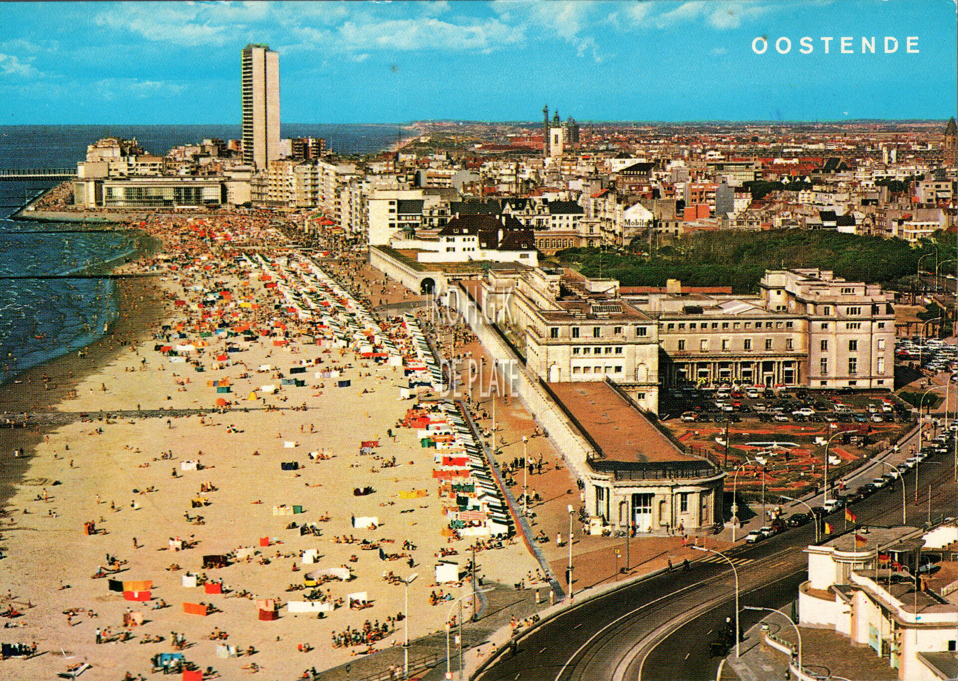 Van Mieghem/AVM. - We zien rechtsonder, detail van de ingang van de Wellingtonrenbaan gelegen langs de Koningin Astridlaan. Strandrecreatie op het groot strand. Het Thermae Palace en de Koninklijke gaanderijen langs de Zeedijk. Verder, de Nieuwe- en Venetiaanse gaanderijen en de Koninklijke villa langs de Albert I-promenade. De westelijke gevel van het Kursaal en het Europacentrum in de Van Iseghemlaan. In het midden de toren van het Feest- en Cultuurpaleis op het Wapenplein.