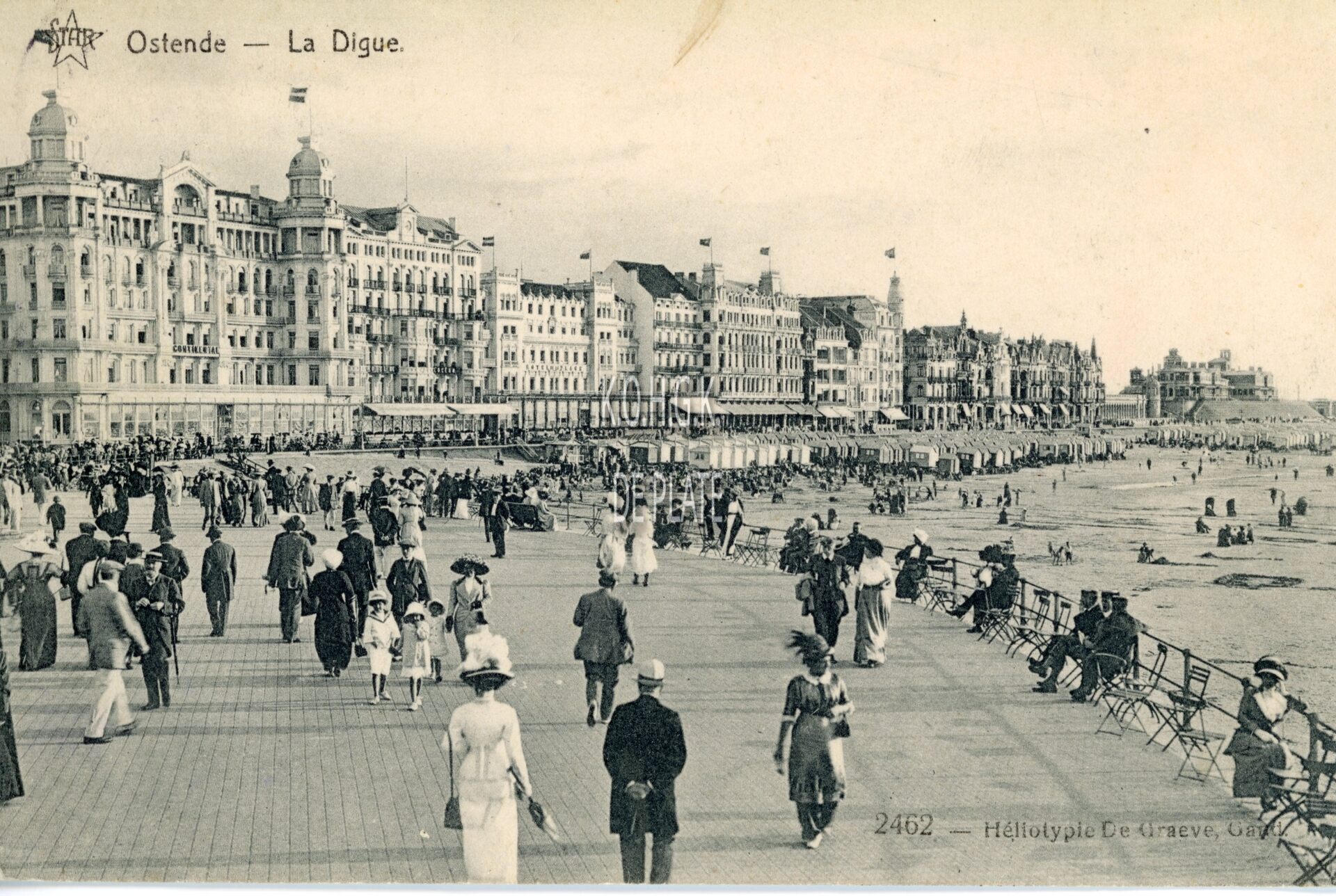 V.l.n.r. : Hôtel Continental, Hôtel de l'Océan, Hôtel de la Plage, Hôtel Beau Rivage, Splendid Hôtel. Uiterst rechts het Koninklijk Chalet.