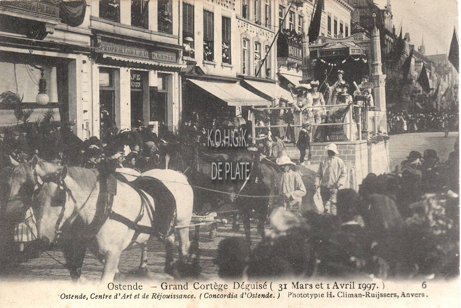 Formaat : 9 x 14,5 cm. - Phototypie H. Climan-Ruijssers, Anvers, N° 6. - Ostende - Grand Cortège Déguisé (31 Mars et 1 Avril 1907). - Ostende, Centre d'Art et de Réjouissance (Concordia d'Ostende). - Hier met hun praalwagen op het Wapenplein. - Fout jaartal op de postkaart : 1997 = 1907