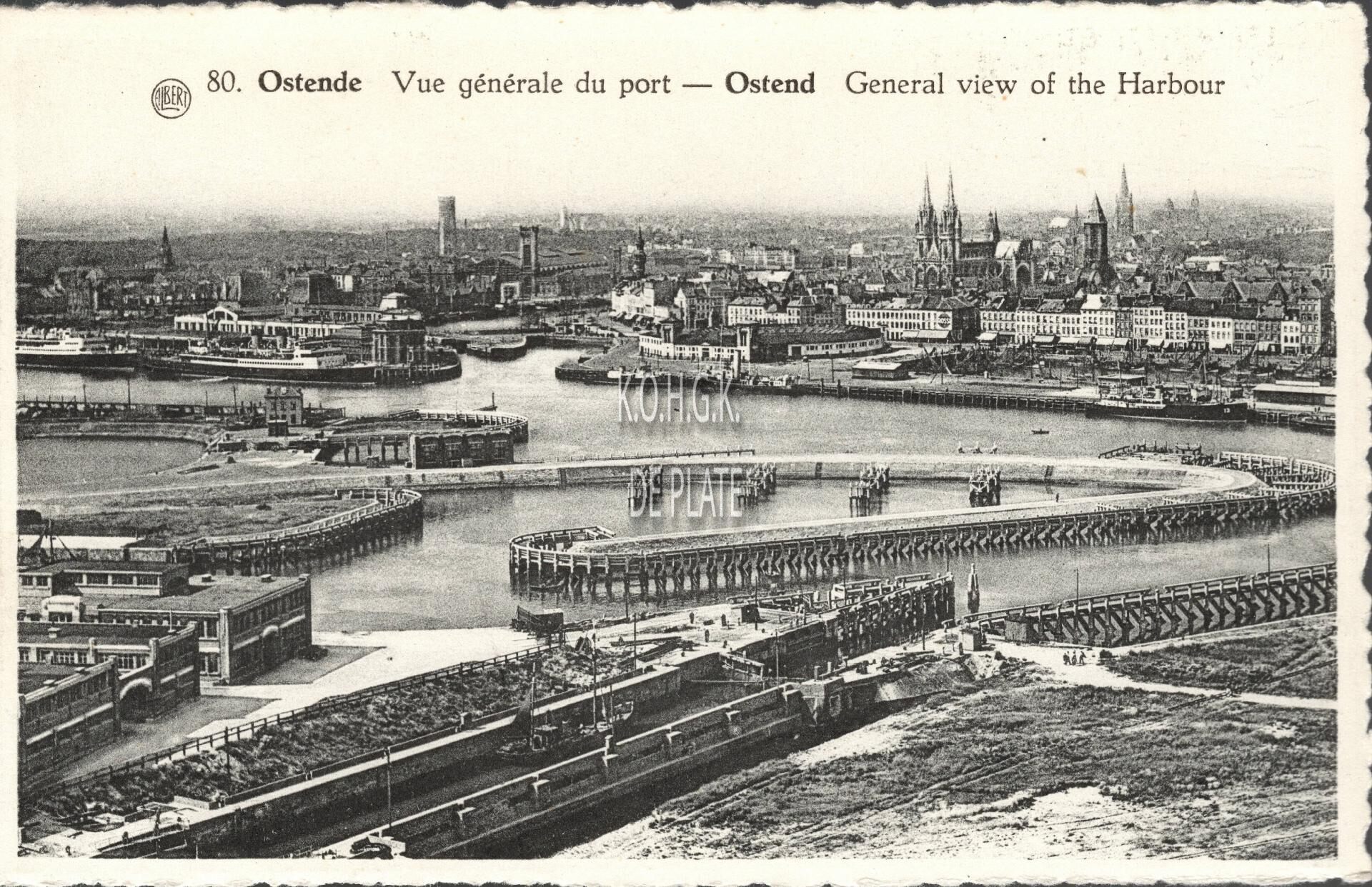 Albert, N° 80.Phototypie A. Dohmen, Bruxelles. - Ostende - Vue générale du port. Ostend - General view of the Harbour. - Panorama van de haven. Vooraan, de zeesluis die de verbinding is tussen het Visserijdok en de havengeul. Links, de Vismijn en wat hoger langs de havengeul, het geboouw van de bestendige reddingsdienst op de oosteroever. Rechts, de kuisbank en de havengeul en op de achtergrond het centrum van de stad, met o.a. links, een pakketboot van de Oostende - Doverlijn gemeerd nabij het Zeestation. In het midden de oude vismijn, genaamd de "Cirk" en rechts, het Schuildok langs de Visserskaai.. Oostende in het interbellum.