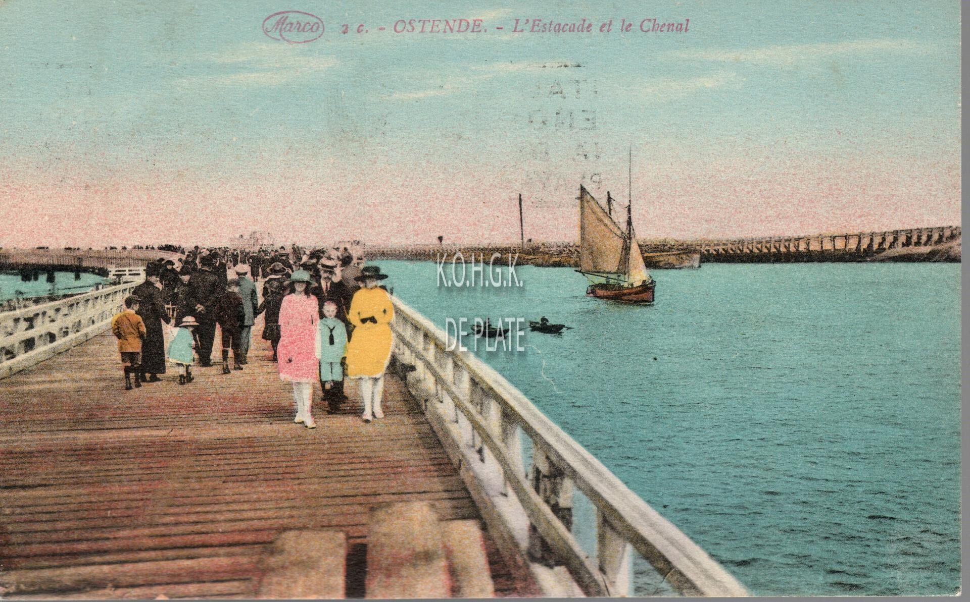 Formaat : 9 x 14 cm. - Marco Marcovici, Bruxelles. N°2 c. - Ostende - L'Estacade et le Chenal. - Veel volk op het weststaketsel. Een vissersvaartuig vaart binnen. Twee jollen, meestal geroeid door gepensioneerde vissers, zorgen voor de verbinding met de oosteroever.