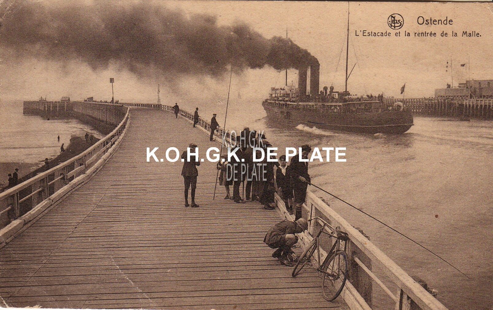 Nels. - Ostende - L'Estacade et la rentrée (sic) de la Malle. - De pakketboot "Princesse Elisabeth" verlaat de haven op weg naar Dover. Links, het Weststaketsel en rechts, een gedeelte van het Ooststaketsel met tijseinpost