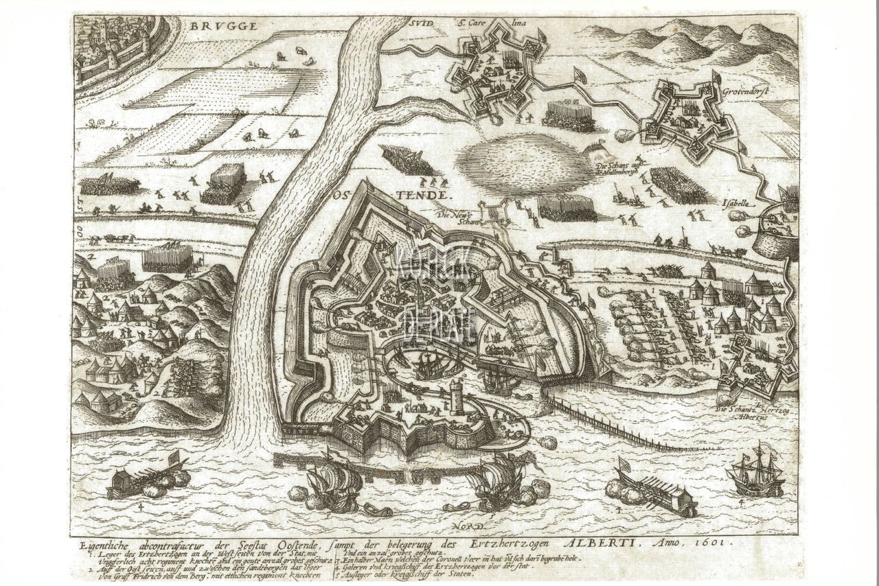 Oostende tijdens het begin van het beleg in 1601. Zicht in vogelvlucht vanuit het noorden. Gefantaseerde voorstelling van de stad met rechts de oude haven en links de nieuwe gevormde "Geule" die door de Spanjaarden onder vuur wordt gehouden vanuit de oostelijke duinen. De stad is omgord door Spaanse forten en schansen : fort Albertus, fort Sint-Isabella, schans Grotendorst en fort Sint-Clara. Links boven een deel van de stad Brugge.