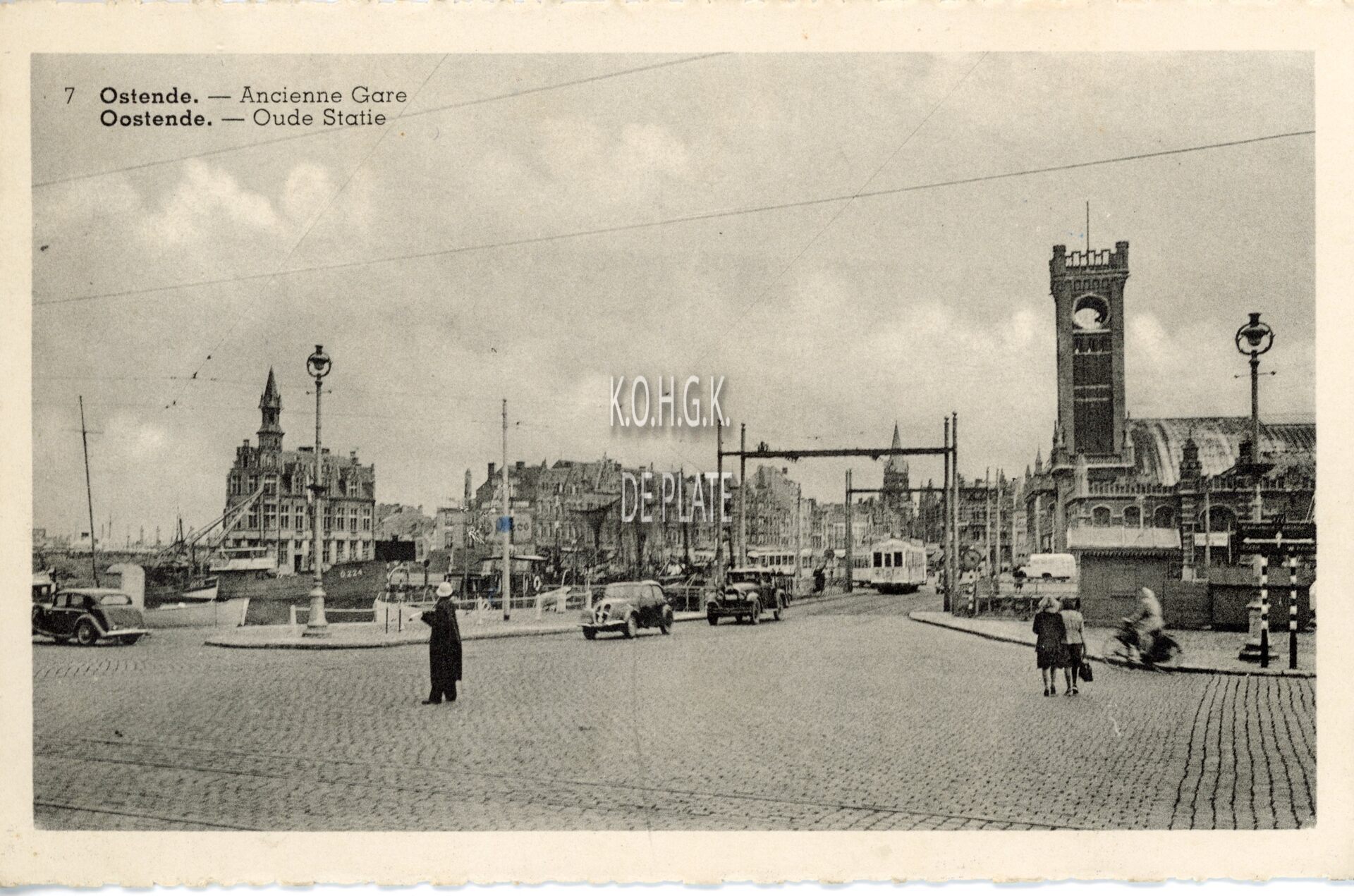 Gegy 7. - Ostende - Ancienne Gare. - Oostende - Oude Statie. - Algemeen zicht op de Hazegraswijk. Rechts het tweede spoorwegstation (1880-1882). Afgebroken in 1955, nadat er reeds sedert 1946 geen reizigersverkeer meer plaats had. Op de voorgrond de Vindictivelaan waar een politieagent het verkeer regelt. Links in het eerste handelsdok zijn vissersvaartuigen aangemeerd, o.a. de O.224 Charles Denise. Sedert 27 februari 1945 werd de Vandersweepplaats omgedoopt tot Ernest Feysplein