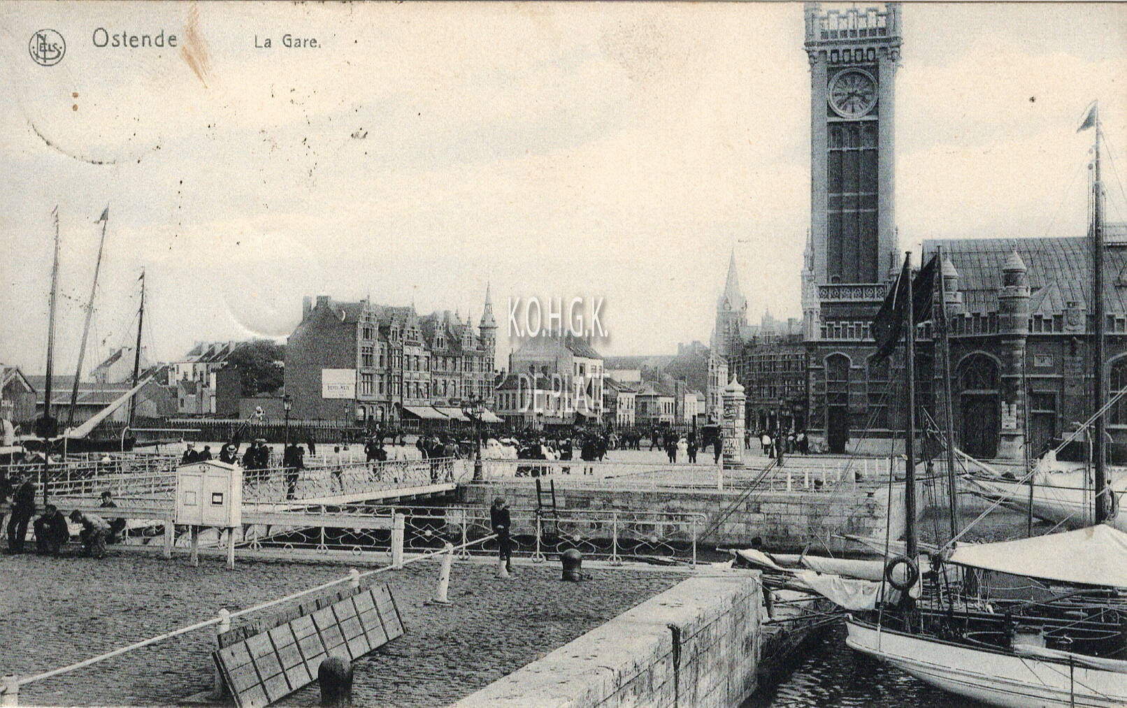 Nels, Bruxelles, Série Ostende, N° 64. - Ostende - la Gare. - Het tweede spoorwegstation van Oostende (Oostende-Stad) aan de Vandersweepplaats op de wijk Hazegras. Nu, het Ernest Feysplein. Links, de Kapellebrug over de handelsdokken. Merk op, de reclamezuil van de Stad Oostende.