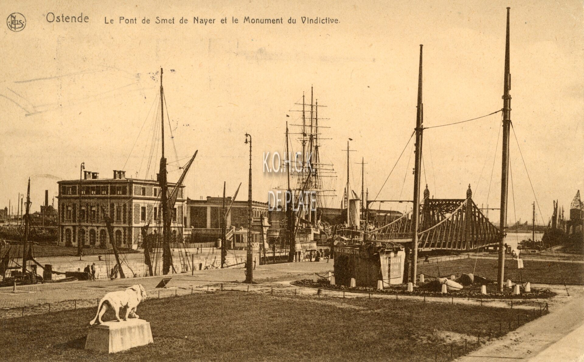 Nels/Thill série 13, 120. - Le Pont de Smet de Naeyer et le Monument du Vindictive. - Het Vindictivegedenkteken, oorlogsmonument gelegen tussen de Demey-brug en de Graaf de Smet de Naeyer-brug. Bestaande uit de boeg van het Engelse oorlogsschip "Vindictive" en de masten van de Engelse oorlogsschepen "Thetis" en "Intrepid". Deze drie schepen werden tijdens de Eerste Wereldoorlog tot zinken gebracht, respectievelijk in Oostende en Zeebrugge, om de havens te blokkeren voor Duitse duikboten. Na de oorlog verwijderd en gedeeltelijk gebruikt als gedenkteken. Links het gebouw van de havendirectie, afgewerkt in 1910. Verder het stapelhuis Entrepot en het douanegebouw gebouwd in 1908 en gelegen langs de Oostkaai van het Vlotdok.