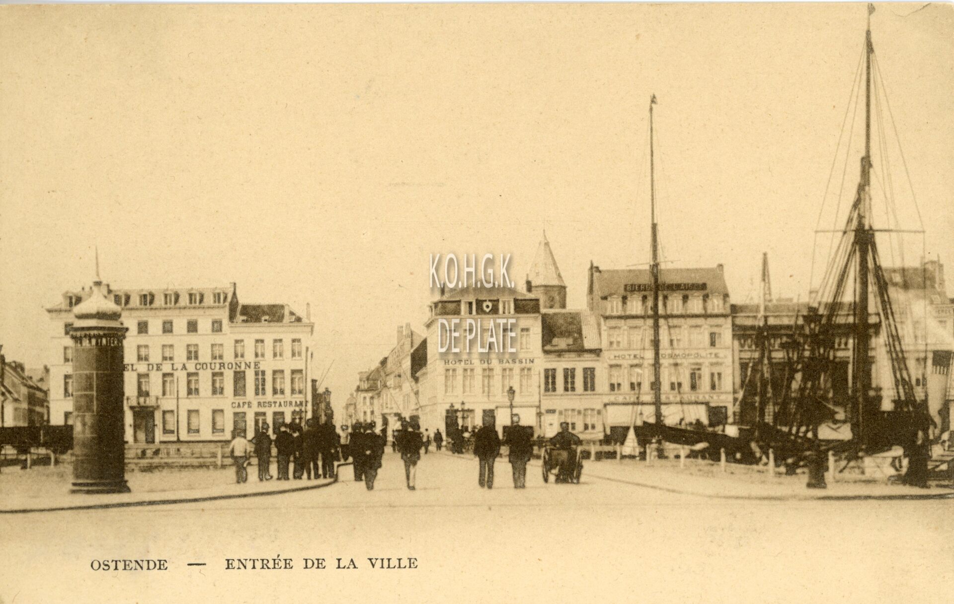 De Kapellebrug en rechtdoor de Kapellestraat. De Kappellebrug was de verbinding tussen het spoorwegstation gelegen langs de Vandersweepplaats en het centrum van de stad. Rechts, het eerste handelsdok en links, het tweede handelsdok. Links, een reclamezuil van de Stad Oostende. Op de achtergrond, de hotels Hôtel de la Couronne, Hôtel du Bassin en Hôtel Cosmopolite