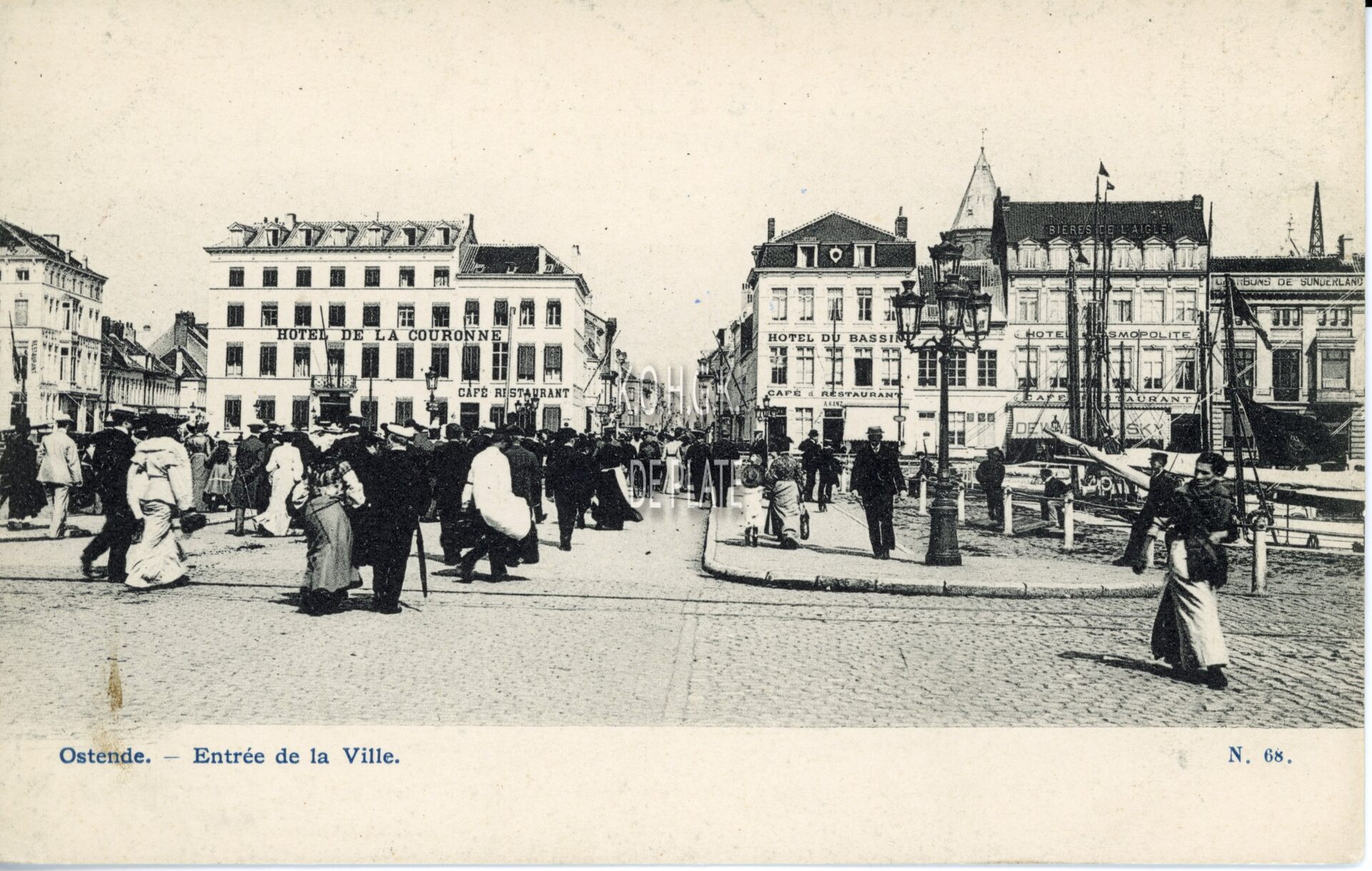 N. 68. - Ostende - Entrée de la Ville. - Veel volk op de Kapellebrug richting de Kapellestraat. Op de achtergrond, de hotels "De la Couronne", "Du Bassin" en "Cosmopolite" langs de Keizerskaai. Na de Eerste Wereldoorlog herdoopt in Vindictivelaan. Boeiende foto uit de Belle Epoque periode. Arm en rijk door elkaar.
