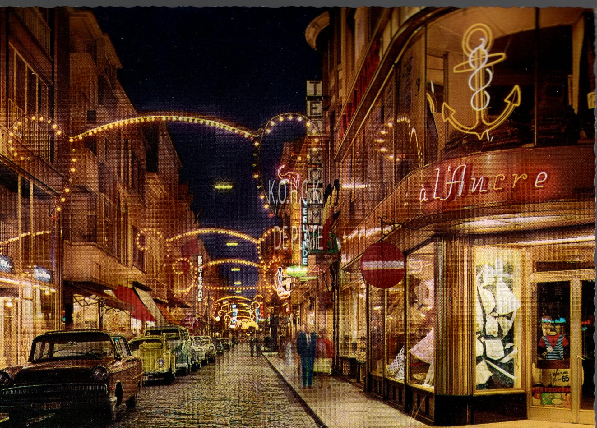 Kruger, N°933/88. - Oostende - Kapellestraat bij Nacht. - De Kapellestraat, waar je met de auto mocht parkeren. Op de hoek met de Sint-Sebastiaanstraat, de textielwinkel "In het Anker = A l'Ancre", Kapellestraat 1