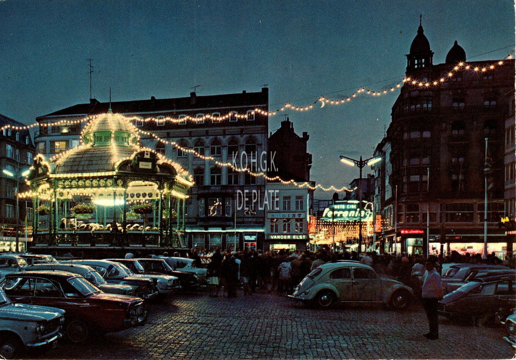 JVDB, N° ZN/8. - Nachtopname. De muziekkiosk verlicht op het Wapenplein. Een muziekharmonie speelt een concert. In de zeventiger jaren speelde op donderdag- en zondagavond de stadsharmonie. Koning auto kon toen nog zonder veel problemen parkeren op de markten. Rechtdoor, de Adolf Buylstraat.