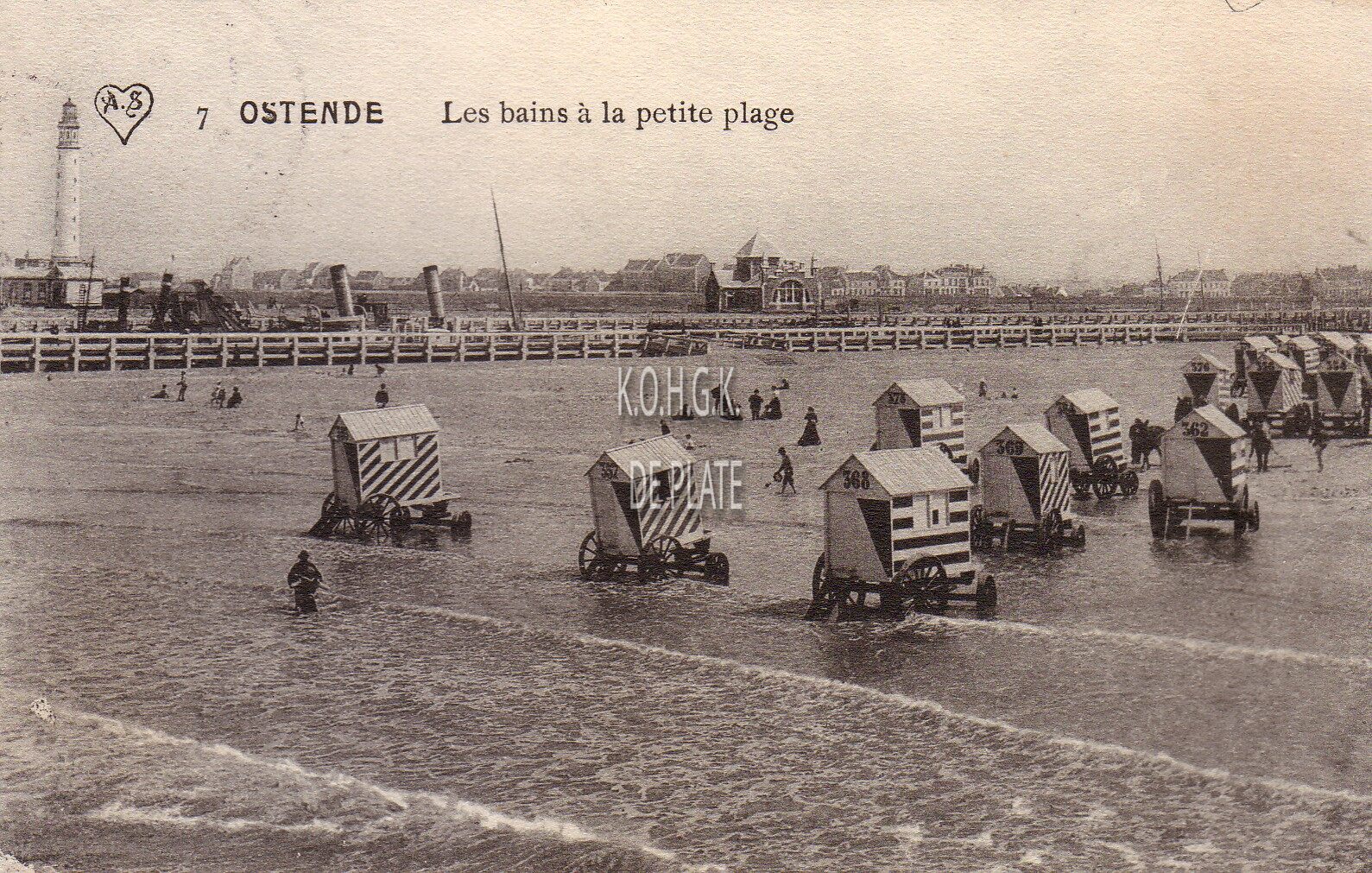 Edit. A. Scheers, Forest-Bruxelles, N° 7. - Ostende - Les bains à la petite plage. - Het Klein Strand met de traditionele badkarren. We zien links op de oosteroever, de Tweede Vuurtoren en het gebouw van de Quarantaine. Op de achtergrond, de huizen van de oude Vuurtorenwijk.