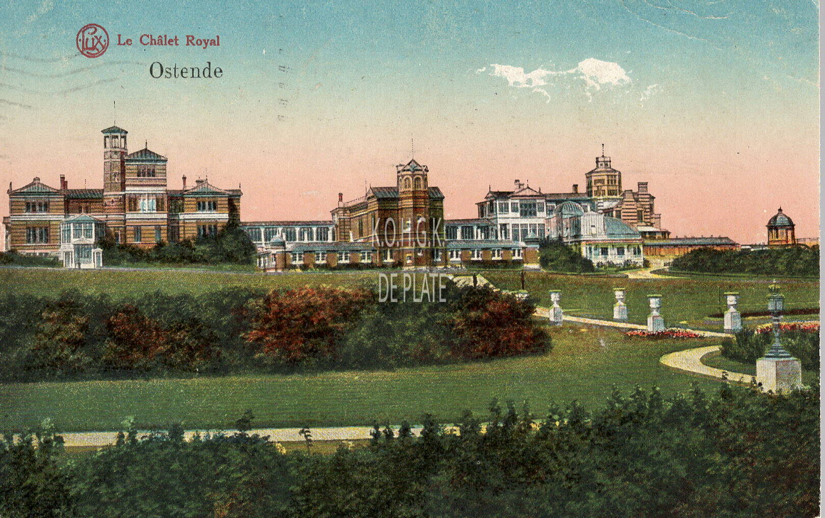 Lux, SéR, 116, 4. - Le Châlet Royal Ostende. - Gekleurde postkaart. - De zuidkant van het Koninklijk Chalet met zijn tuinen, gezien vanaf de Koninigin Astridlaan