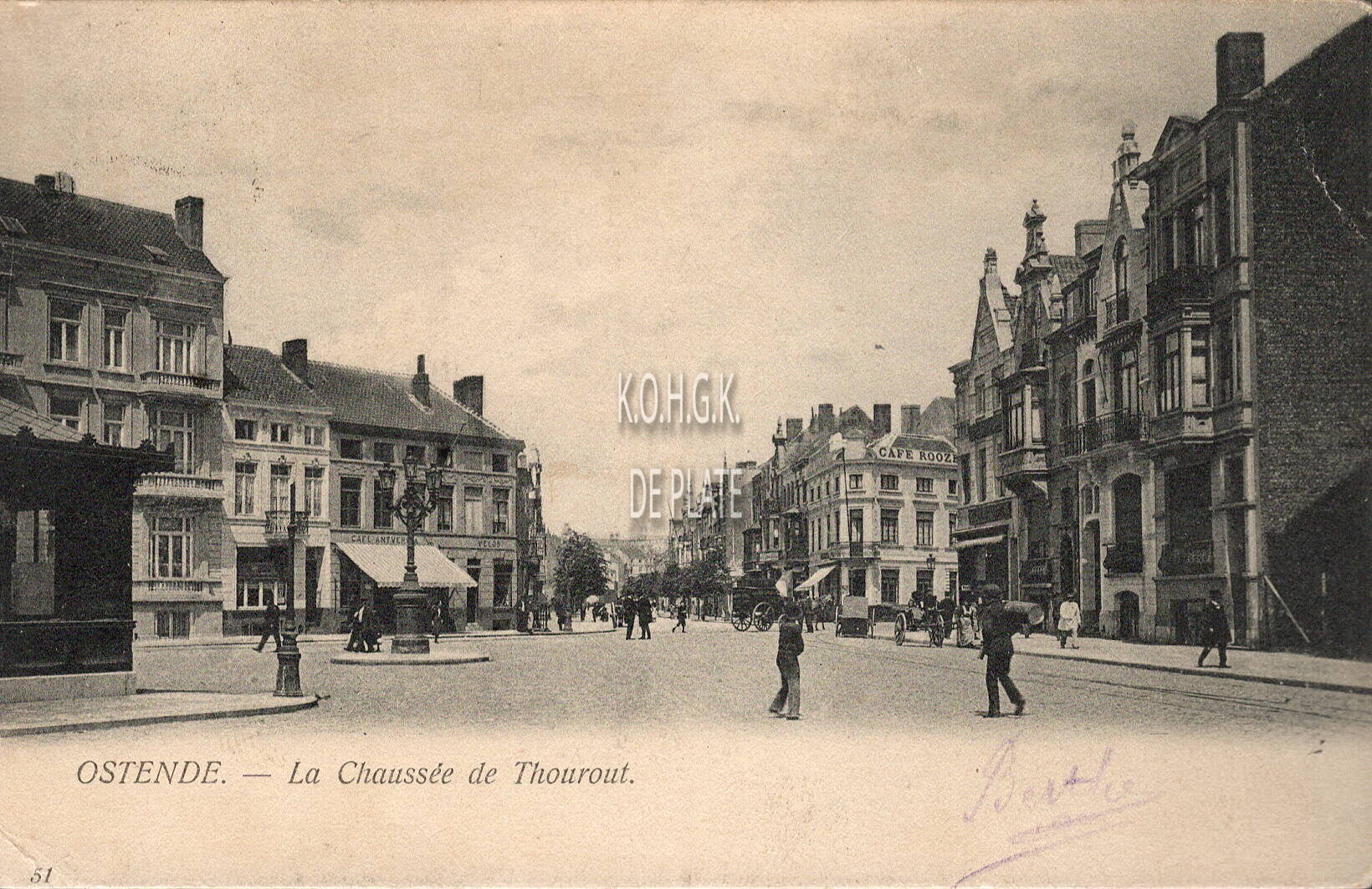 Th. van den Heuvel, éditeur, Bruxelles. - Ostende - La Chaussée de Thourout. - Het kruispunt Petit Paris en rechtdoor de Torhoutsesteenweg. Links, een gedeelte van het tramwachthuisje. In het midden een sierlijke lantaarnpaal
