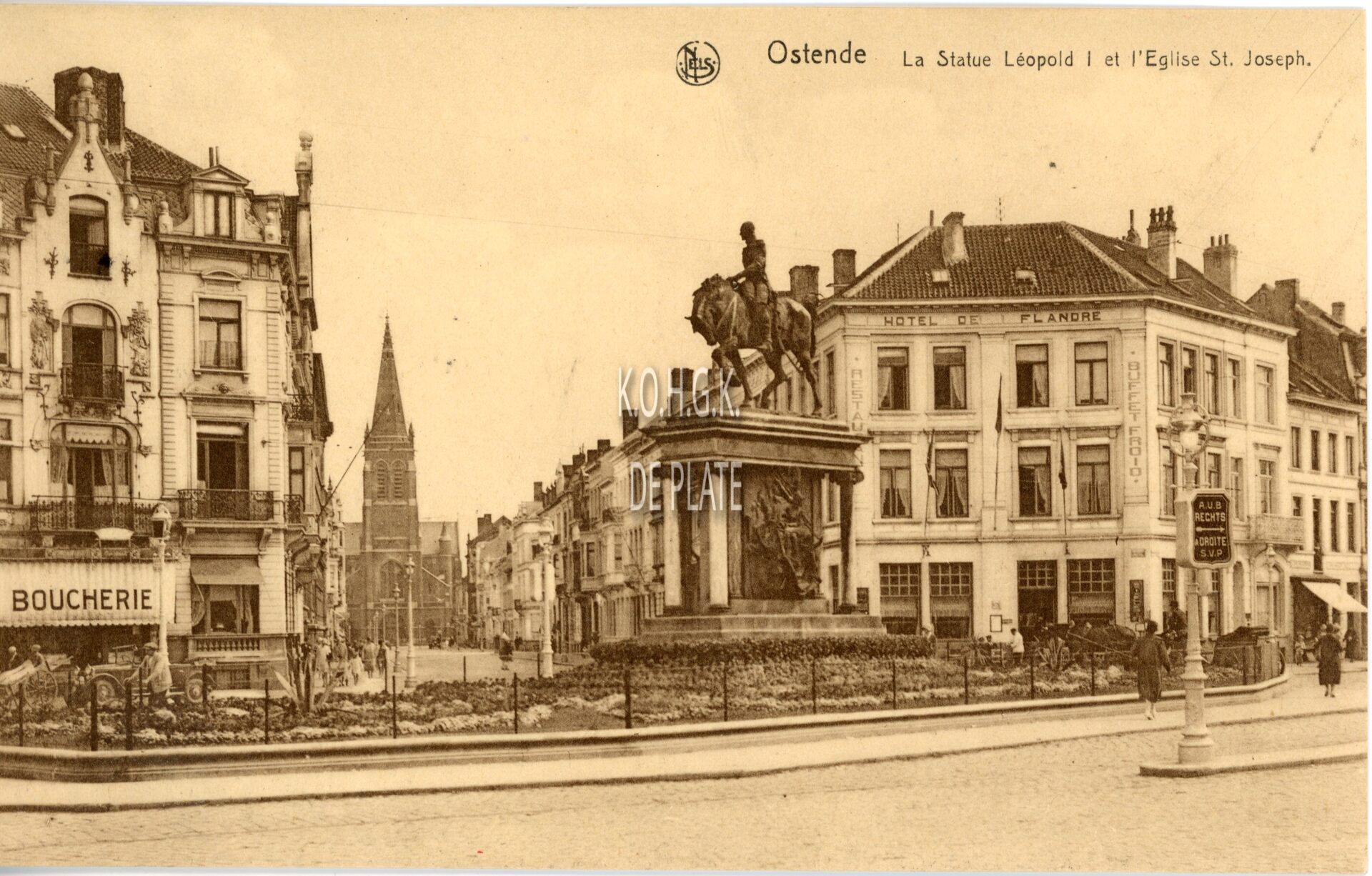 Rechtdoor de Rogierlaan met in de verte deSit-Jozefskerk. Rechts naast het monument Hotel de Flandre. Het hotel had 25 kamers, 1 badkamer, lopend water en geen centrale verwarming. Het was open van mei tot september.
