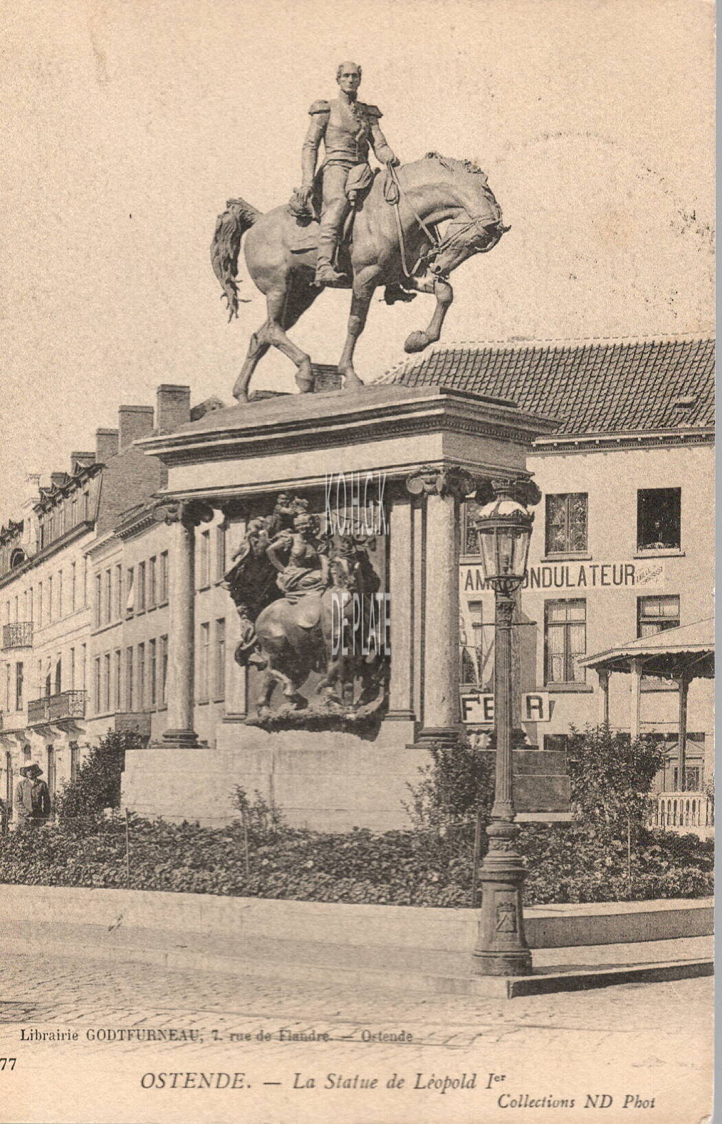 [Neurdein], ND Phot, nr.77 + Godtfurneau, Librairie, 7, Rue de Flandre, Ostende. - Ostende - La Statue de Léopold Ier. - Het monument van koning Leopold I op het Leopold-plein.