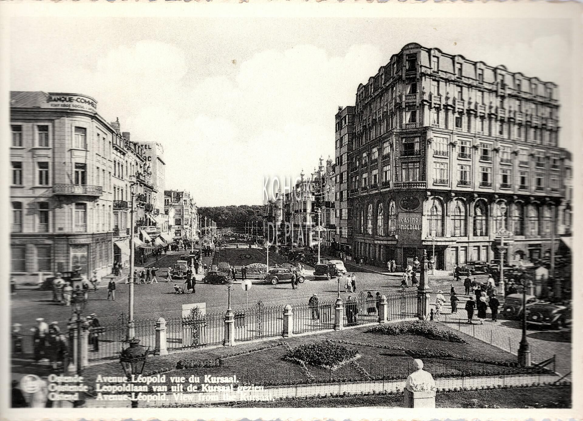 Formaat : 10,5 x 15 cm. - Nels "Bromurite". - Ostende - Avenue Léopold vue du Kursaal. Oostende - Leopoldlaan van uit de Kursaal gezien. Ostend - Avenue-Léopold, View from the Kursaal. - De Leopoldlaan gezien vanaf de zuidkant van het Kursaal richting het Leopoldpark. Vooraan in de hovingen van het Kursaal, detail van het James Ensor-monument. Links, op de hoek "Banque de Commerce", Leopoldlaan 29 en rechts "Hotel Impérial", Van Iseghemlaan 70-72 en hoek Leopoldlaan 34.