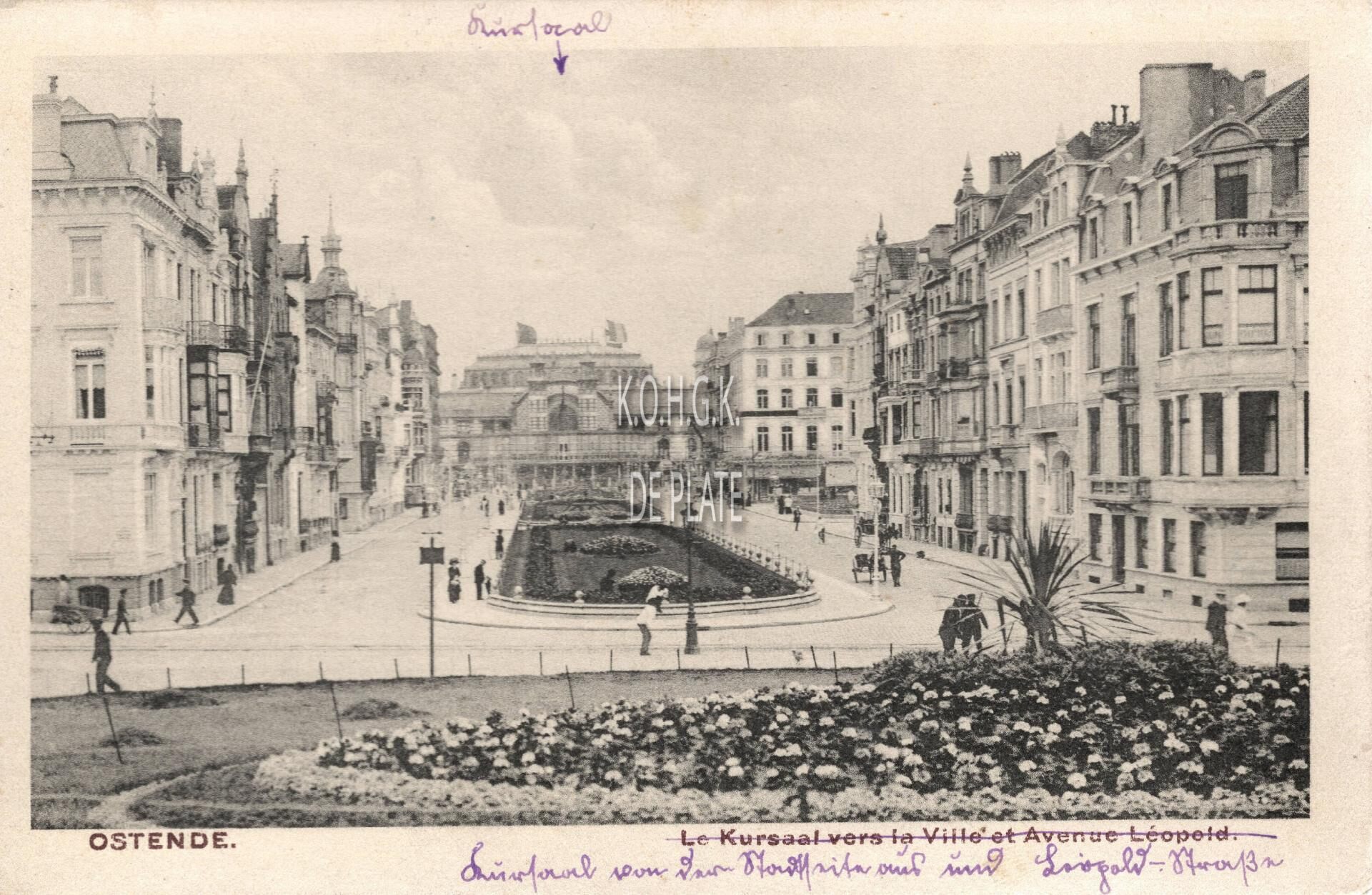 Ostende - Le Kursaal vers la Ville et Avenue Léopold. - De Leopoldlaan gezien vanuit het Leopoldpark richting de zuidgevel van het derde kursaal. Vooraan links en rechts, de hoek met de Karel Janssenslaan