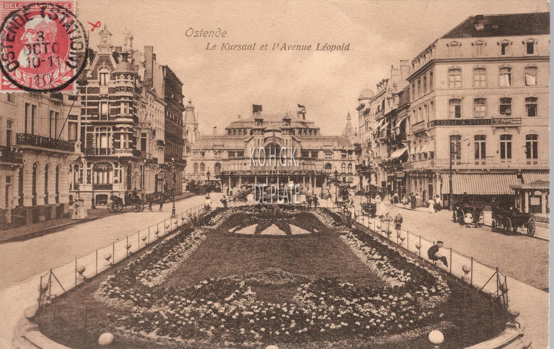 Edition V.G.[=Victor Grégoire], 42, av. midi [Bruxelles], 10 77030. - Ostende - Le Kursaal et l'Avenue Léopold. - De Leopoldlaan richting de hoofdingang van de vernieuwde derde Kursaal. Rechts, op de hoek met het Marie-Joséplein, de "Banque et Change" van Maurice Elleboudt, Leopoldlaan 20. Aan de overkant, een ijscokar. Koetsiers wachten op klanten aan het Marie-Joséplein. Let op de altijd verzorgde bloemenperken door de groendienst van de stad. Oostende tijdens een zomerse dag tijdens de Belle Epoque.