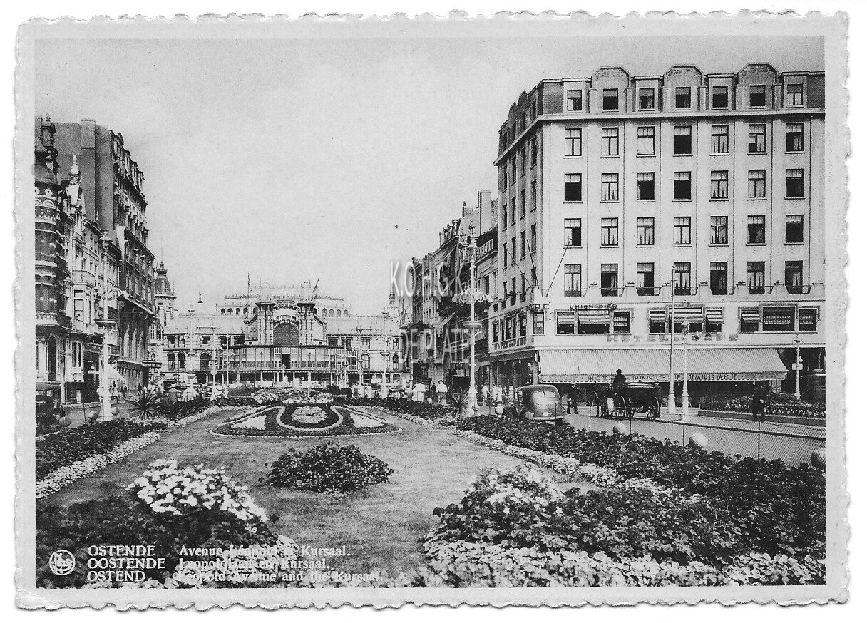 Nels. - Ostende - Avenue Léopold et Kursaal. Oostende - Leopoldlaan en Kursaal. Ostend - Leopold Avenue and the Kursaal. - De Leopoldlaan gezien richting de hoofdingang van de derde Kursaal. Rechts, het "Hotel du Parc" op de hoek met het Marie-Joséplein. Waar de koetsier wacht op klanten, staan nu taxi's. Let op de altijd verzorgde bloemenperken door de Groendienst van de Stad. De sierlijke lantaarns zijn verdwenen na het doortrekken van de Leopoldlaan door het Leopoldpark in de vijftiger jaren. Prentkaart uit de dertiger jaren.