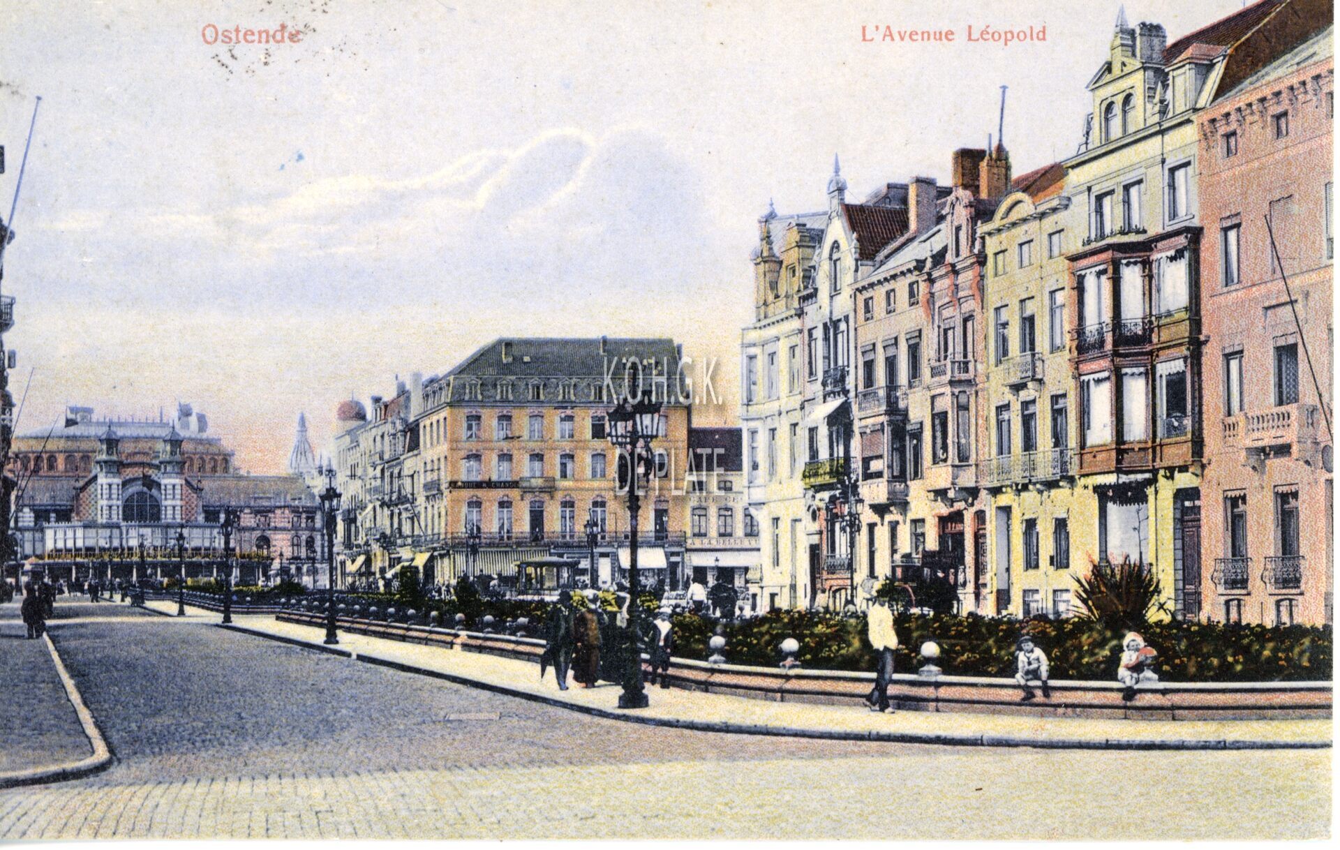 Grande Galeries Belges Osrende, 3112 a. - Ostende - L'Avenue Léopold. - Bijgekleurde kaart. - We zien de Leopoldlaan, richting de zuidgevel van het derde Kursaal. Rechts, de open ruimte is het Marie-Joséplein. Voor 1907, Komedieplaats(plein) of Schouwburgplein genaamd.