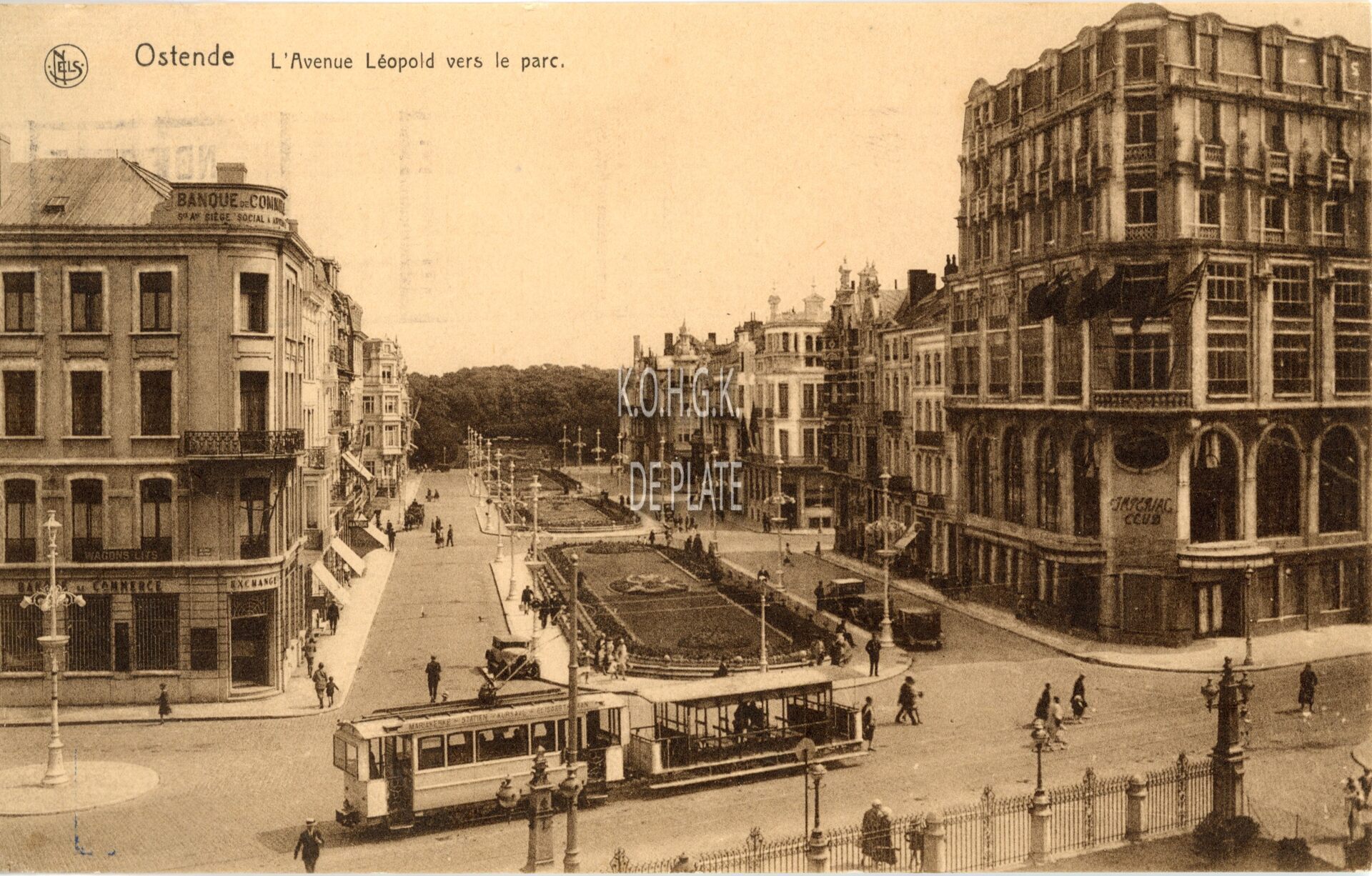 De Leopoldlaan gezien vanaf het Kursaal richting het Leopoldpark. Links op de hoek Banque de Commerce en rechts Hotel Impérial. Een tram spoort in de Van Iseghemlaan.
