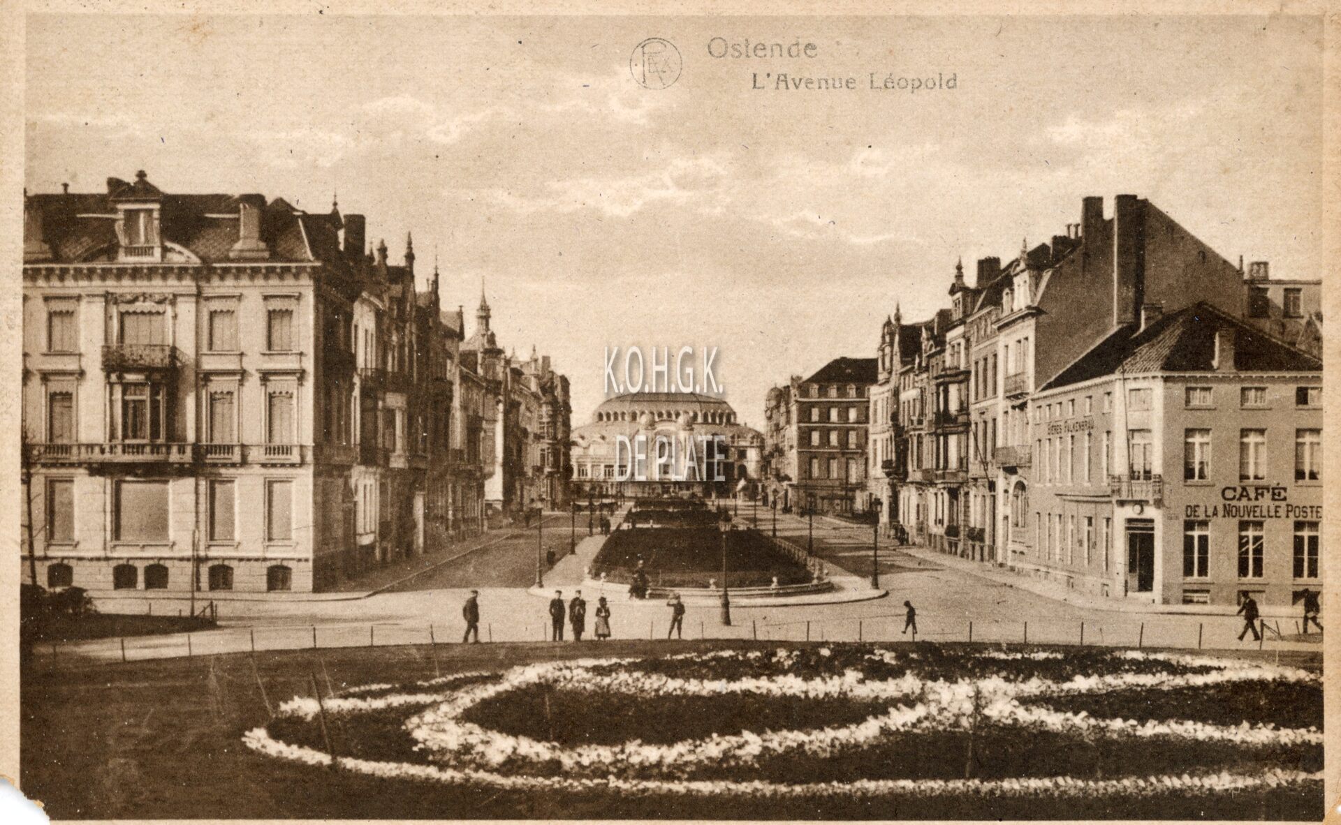 De Leopoldlaan gezien vanuit het Leopoldpark met op het einde het tweede kursaal. Links de Karel Janssenslaan. Rechts, op de hoek van met de Wittenonnenstraat, Café de la Nouvelle Poste, vroeger Café de l'Avenue Léopold
