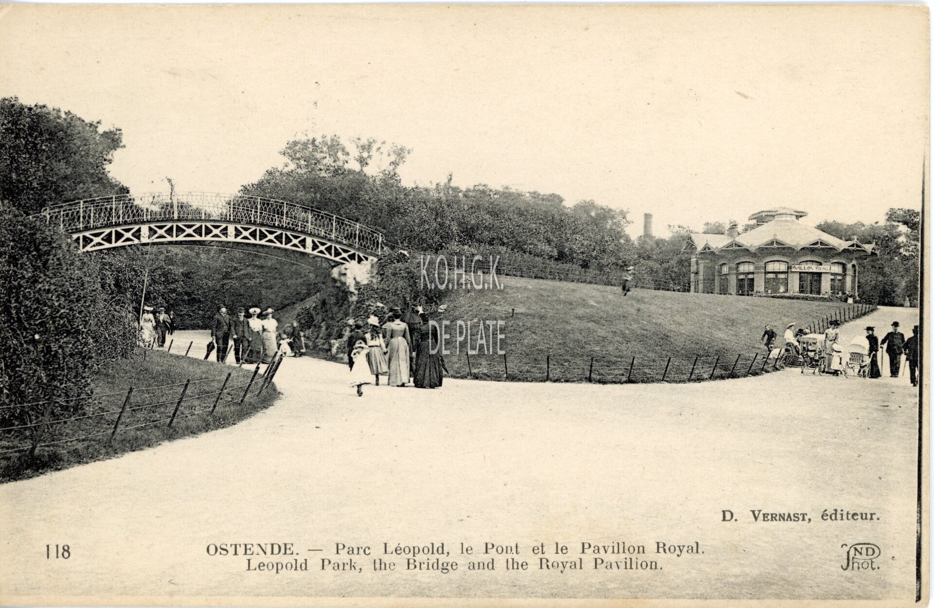 Omschrijving Neurdein/ND Phot/Vernast. 118. -Ostende - Parc Léopold, le Pont et le Pavillion Royal. Leopold Park, the Bridge and the Royal Pavilion. Trefwoorden POSTKAARTEN NEURDEIN LEOPOLDPARK ; BRUG LEOPOLDPARK ; TRINKHALL BRONWATER Plaatskenmerk ARCHIEF 202 08-09 POSTKAARTENARCHIEF Inventarisnummers 2011/1252 Collectie Postkaartenarchief De Plate Uitgever Vernast D. Neurdein/ND Phot Print