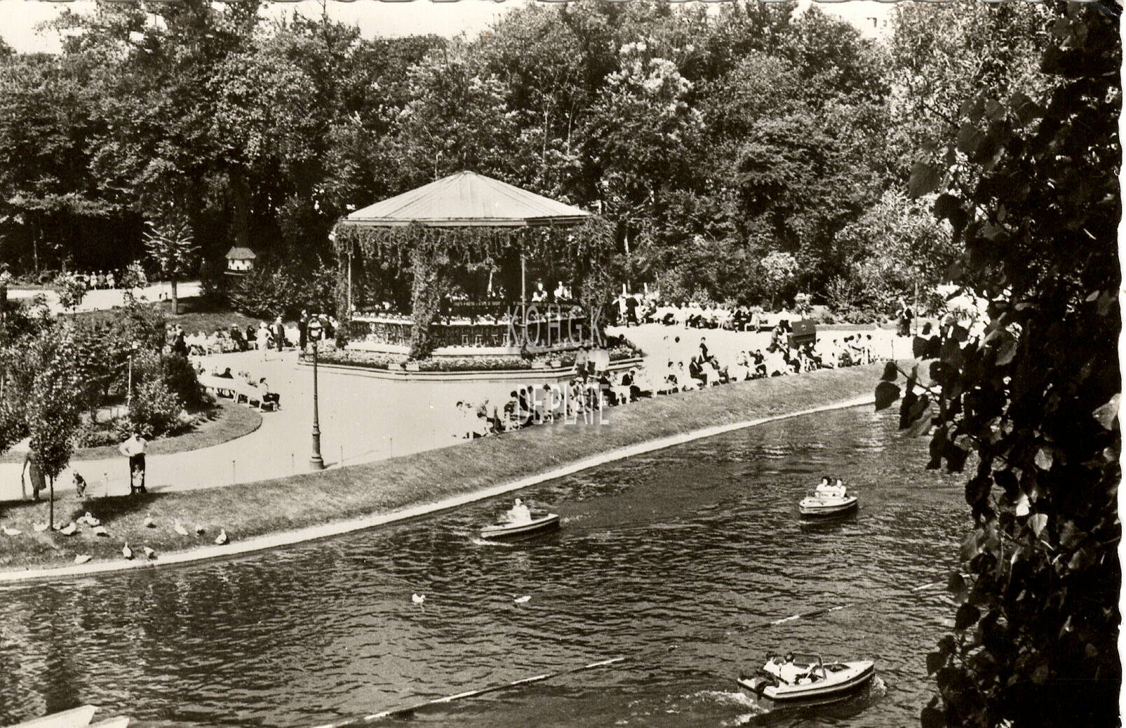 Uitgave Prevot. - Oostende, Leopoldpark. - Ostende, Parc Léopold. - Tijdens de gemeenteraad van 18 maart 1949 werd een gedeelte van de parkvijver in vergunning gegeven aan pvba "Les Amusements Populaires" vertegenwoordigd door Robert Lannoye, F. Content en A. Lippens voor het inrichten van een attractie met motorbootjes. In 1973 werd dit afgeschaft.