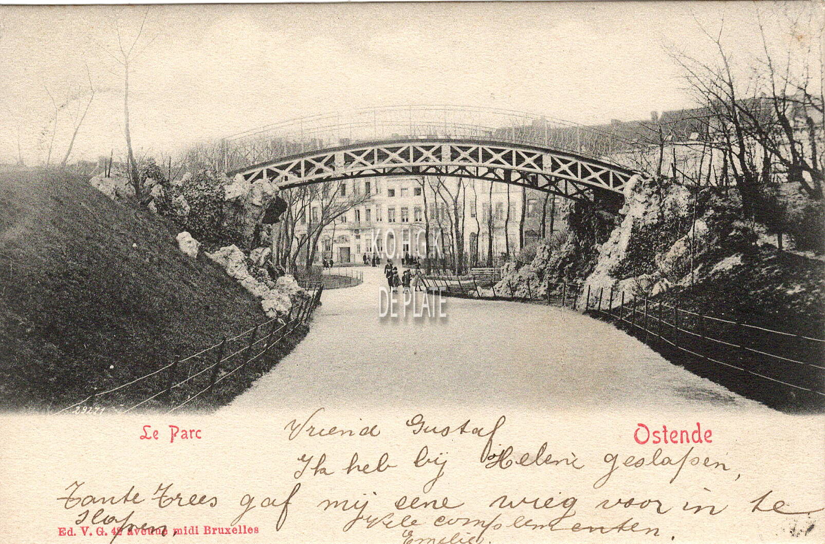 Ed. V.G., 42, avenue midi, Bruxelles. - Ostende - Le Parc. - De ijzeren brug in het Leopoldpark die de verbinding was tussen de fontein en de Trinkhall. Op de achtergrond, de Euphrosina Beernaertstraat