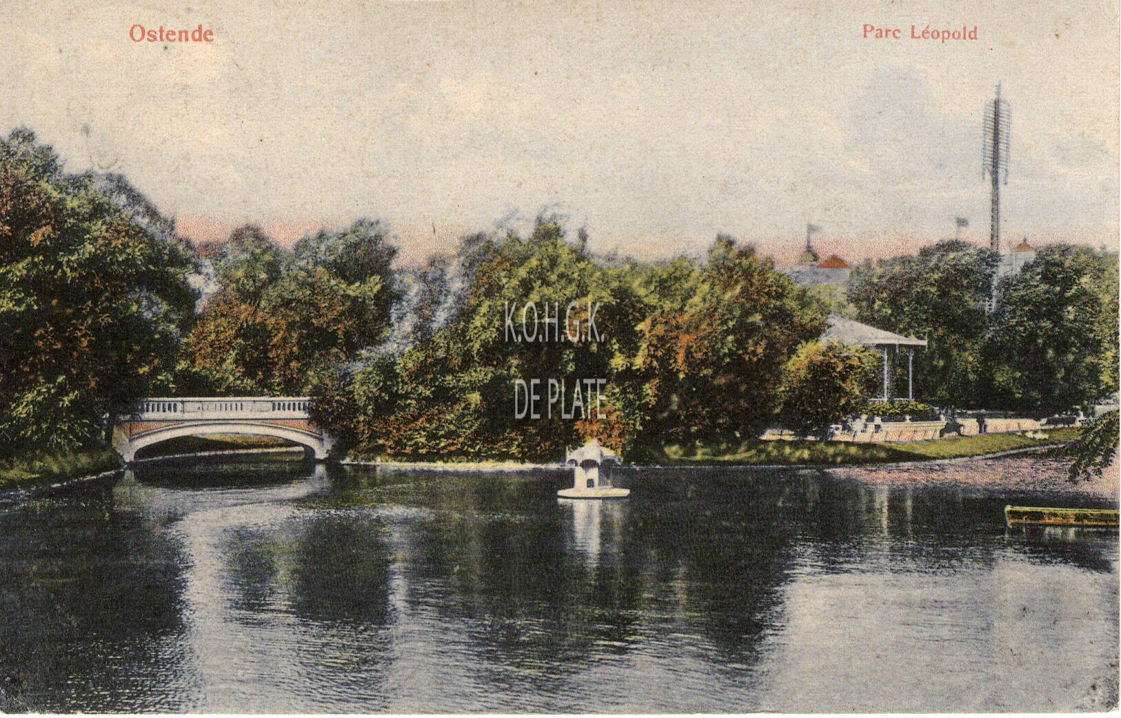 Grandes Galeries Belges, Ostende, N°3118a. - Ostende - Parc Leopold. - Bijgekleurde kaart. - De vijver van het Leopoldpark, met links, de stenen brug en rechts, een gedeelte van de muziekkiosk