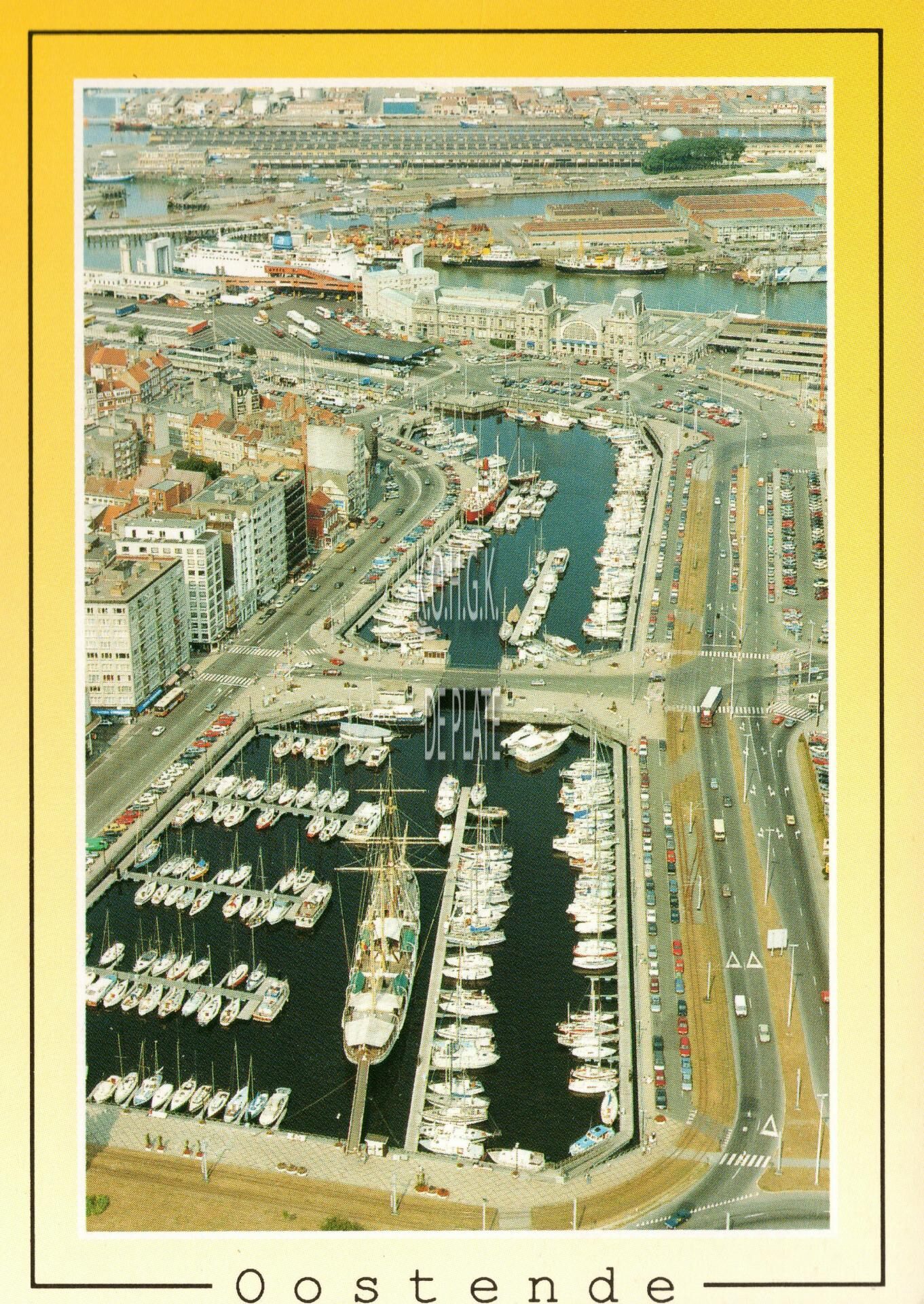 A. Van Mieghem, 8400 Oostende, N° A.294. Oostende - Panorama. Luchtfoto. Het eerste en tweede handelsdok, nu Mercator jachthaven. Links de Vindictivelaan en rechts de Leopold III-laan. Vooraan de "Mercator". Achteraan het Zeestation met de haven, toen er nog Oostende - Dover trafiek was.