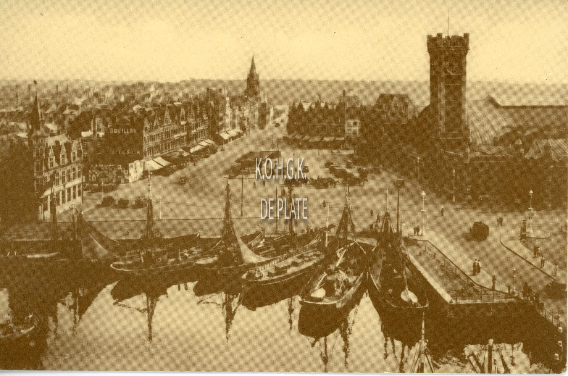 De Vandersweepplaats, vanaf 27 februari 1945 het Ernest Feysplein. Rechts, het tweede spoorwegstation (1882). In het verlengde van het plein de Graaf de Smet de Naeyerlaan, met links op het einde de Onze-Lieve-Vrouw Onbevlekt Ontvangenkerk beter gekend als Hazegraskerk. Op de voorgrond het eerste handelsdok met aangemeerde vissersvaartuigen.