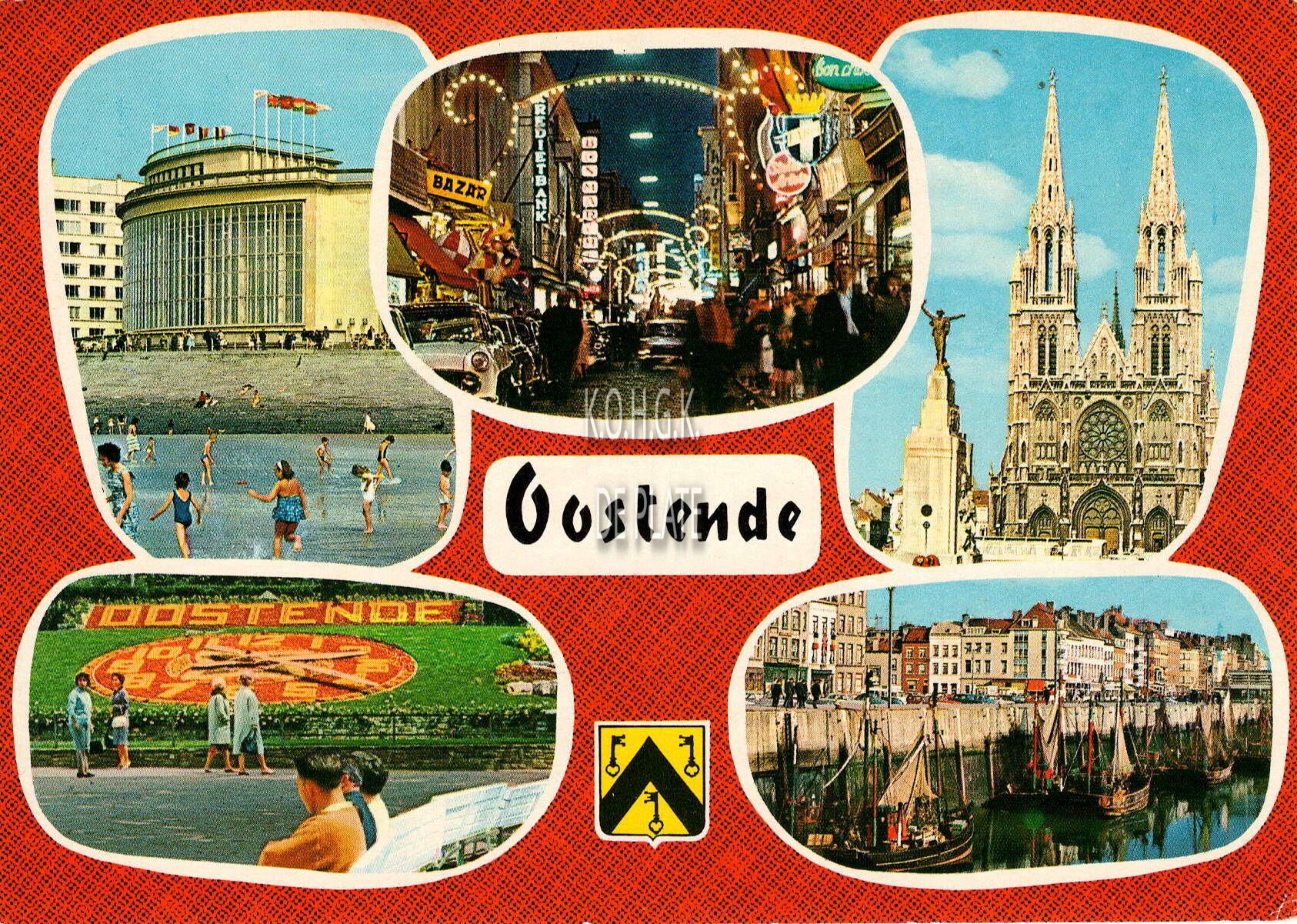 Van Mieghem A., N° 48. - Groeten uit Oostende. Un bonjour de Ostende. Greetings from Ostend. Grüsse aus Ostende. - Inzet : De noordgevel van de vierde kursaal langs de Albert I-promenade gezien vanaf het Groot Strand. De Kapellestraat. De Sint Petrus en Pauluskerk en het oorlogsmonument voor de omgekomen Oostendenaars en Oostendse militairen in beide Werldoorlogen op het Sint Petrus en Paulusplein. Het bloemenuurwerk in het Leopoldpark. Vissersvaartuigen in het Montgomerydok langs de Visserskaai