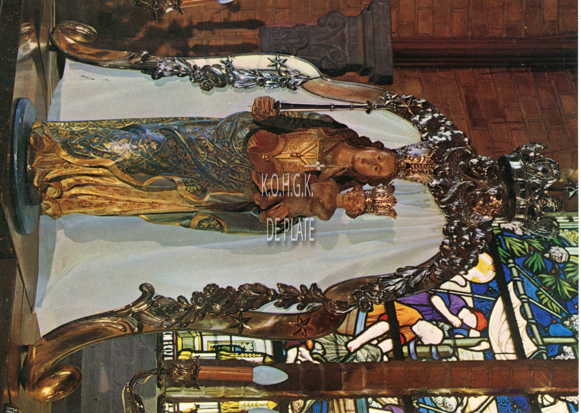 Onze-Lieve-Vrouw met scepter en Jezuskind, beiden met kroon zijn in gepolychromeerd hout. Het beeld staat in een zilveren nis met wit gewaad.