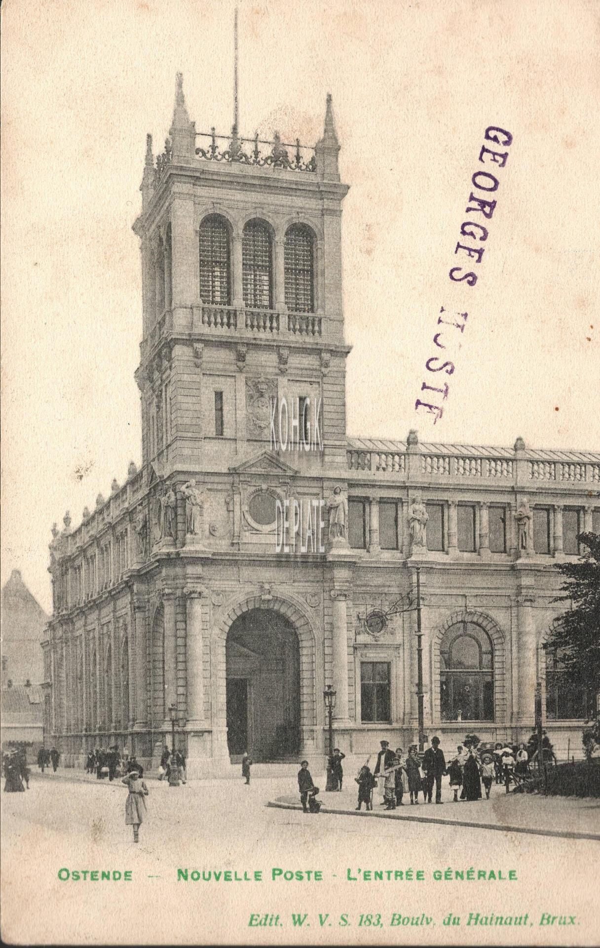Edit. W.V.S., 183, Boulv. du Hainaut, Brux. - Ostende - Nouvelee Post. L'Entrée générale. - Het postgebouw, op de hoek van de Hendrik Serruyslaan (rechts) en de Wittenonnenstraat. Gebouwd naar de plannen van architect Charles De Wulf.