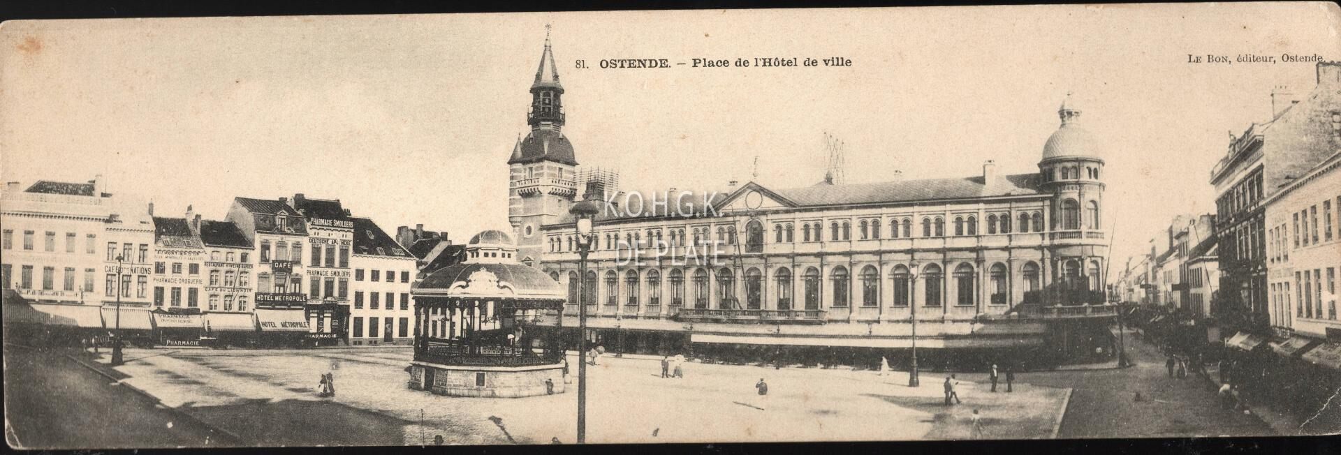 Le Bon 81. - Ostende. - Place de l'Hôtel de ville. - Het Stadhuis op het Wapenplein met rechts de Kapellestraat, op het plein de muziekkiosk en links oude cafés en restaurants