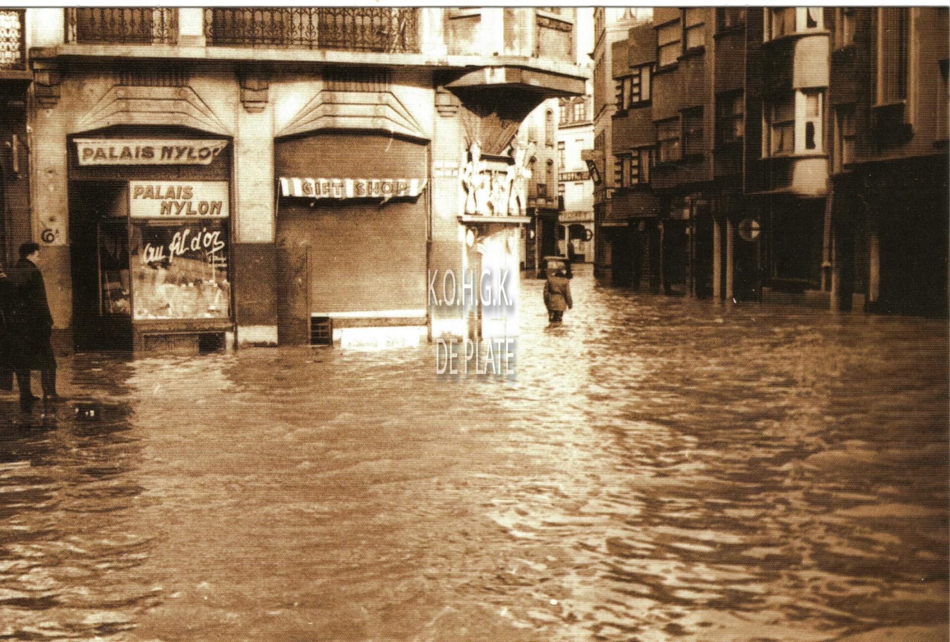 Tropic T 401. - Ostende oender woater 1953. - Hoek Marie-Joséplein en Madridstraat. De handelszaken "Au Fil d'Or" (Palais Nylon) en ernaast, een souvenirwinkel. Rechts, de Madridstraat